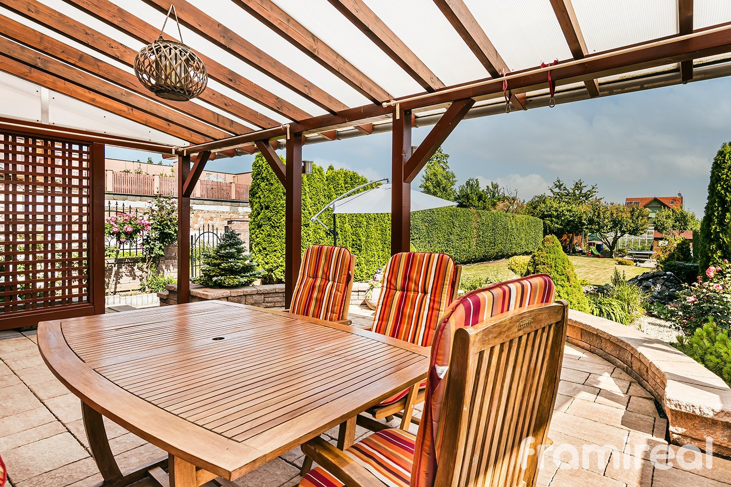 Z obývací části je vstup na terasu krytou pergolou, která poskytuje prostor pro venkovní posezení a výhled do zahrady s pečlivě udržovanou zelení.