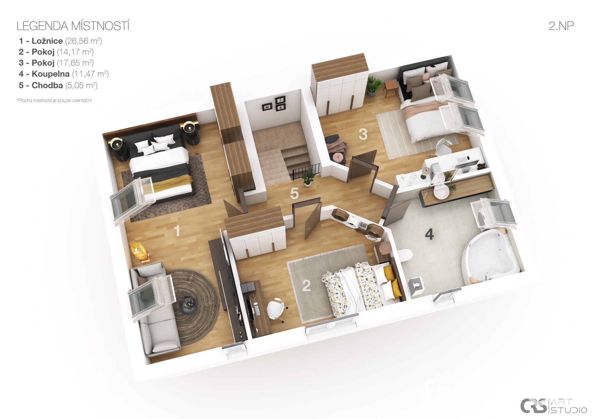 V patře jsou umístěny tři prostorné pokoje, koupelna s rohovou vanou a toaletou a pochozí půda vhodná pro úložné účely. Vytápění v patře je řešeno radiátory.