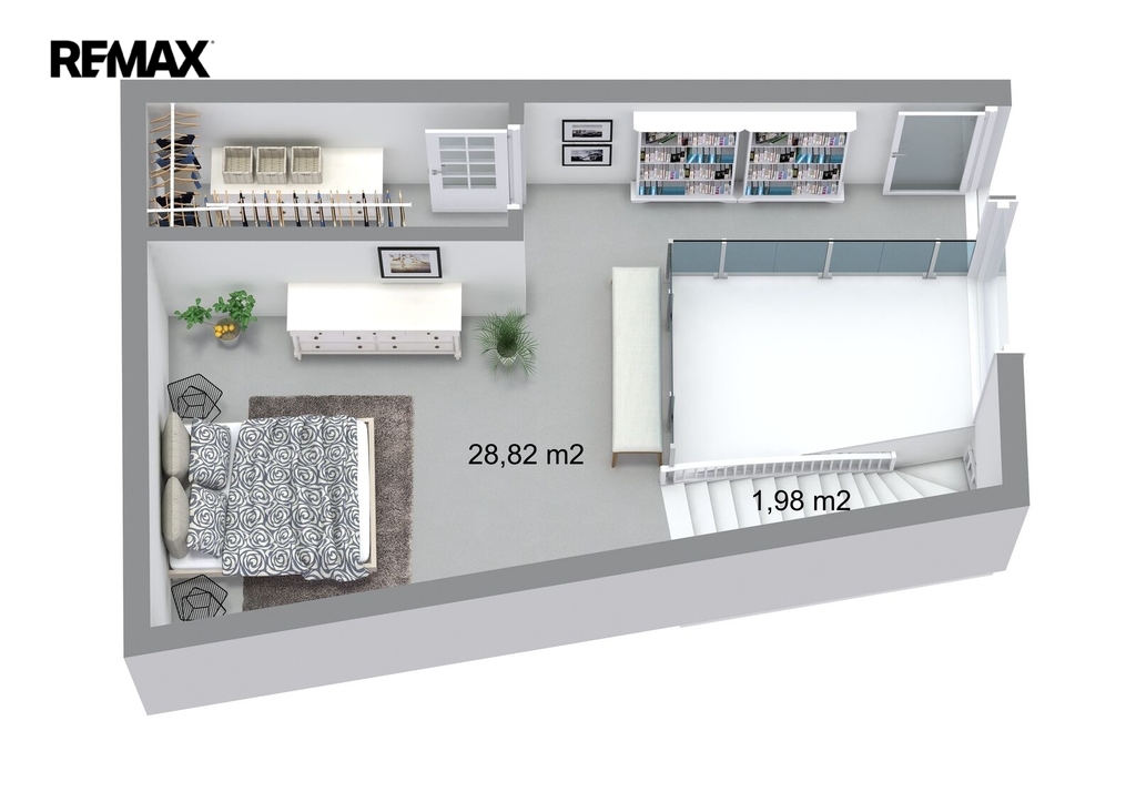 V přízemí šatna, hala se schodištěm, navazuje kuchyň, jídelní kout a obývací pokoj. Odtud vstup na dvorek a sklípek. Zahrada je ve svahu. V horním patře je pak ložnice a WC.