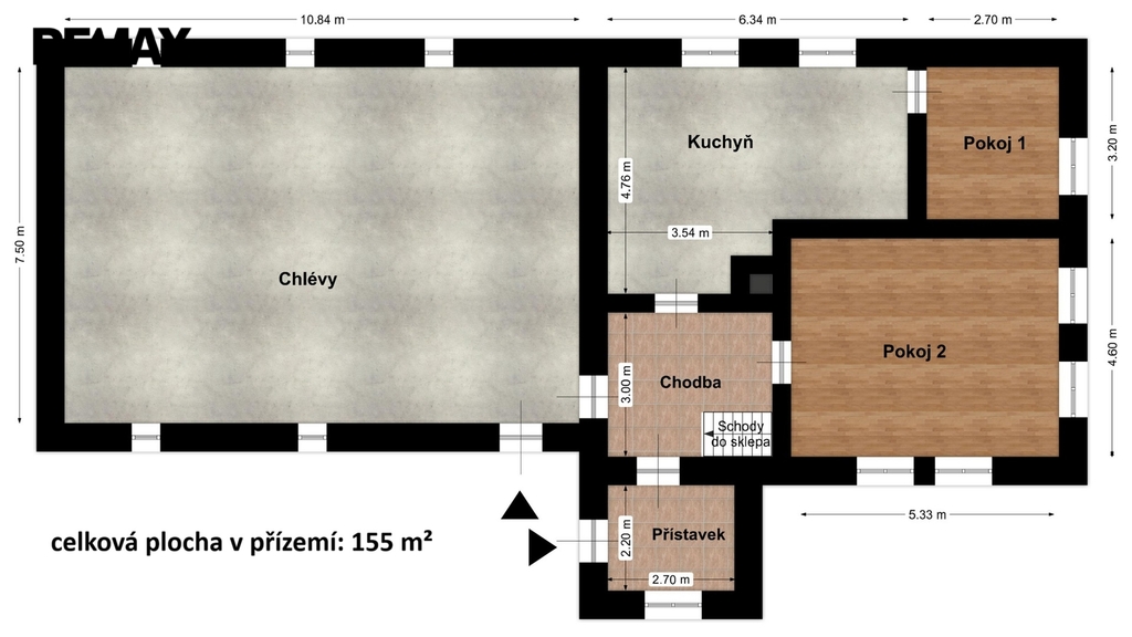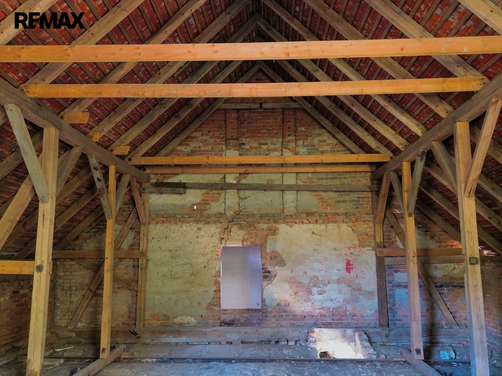 Přízemí domu o ploše přibližně 155 m² bylo původně rozděleno na obytnou část a část využívanou pro chov, patro pak nabízí kolem 145 m². K domu patří jeden menší sklep (13.5 m²) a na okraji pozemku další tři kamenné sklepy o celkové ploše přibližně 40 m², ideální například jako vinný sklípek či sklad. Na pozemku je rovněž elektrorozvodová skříň. Dům je určen ke kompletní rekonstrukci, přičemž zachovává cenné historické prvky, jako například původní trámy staré přes 200 let. Střecha domu je v dobrém stavu, místy vyžaduje drobné opravy. Statika je zachována, což poskytuje dobrý základ pro novou podobu domu.