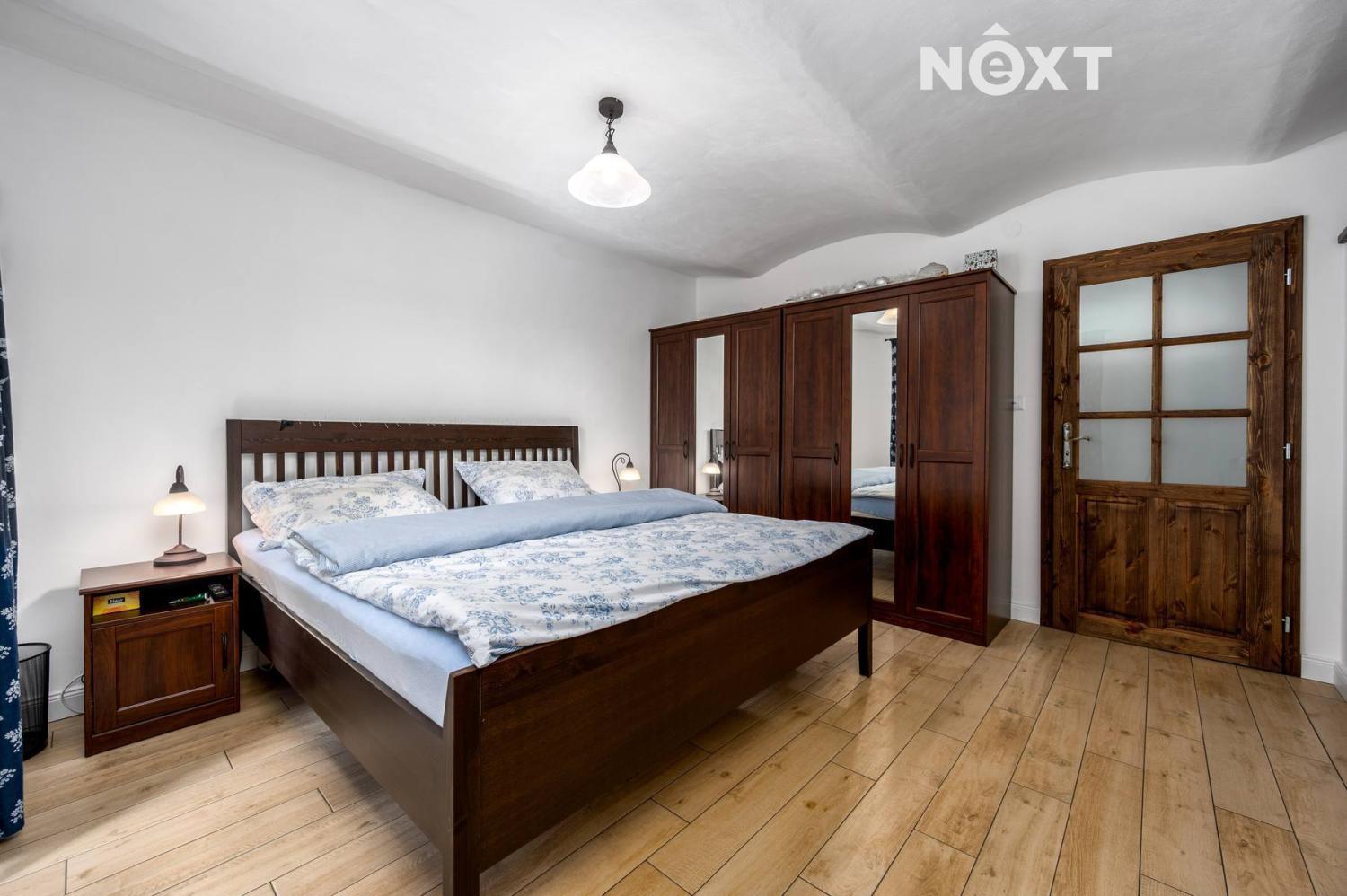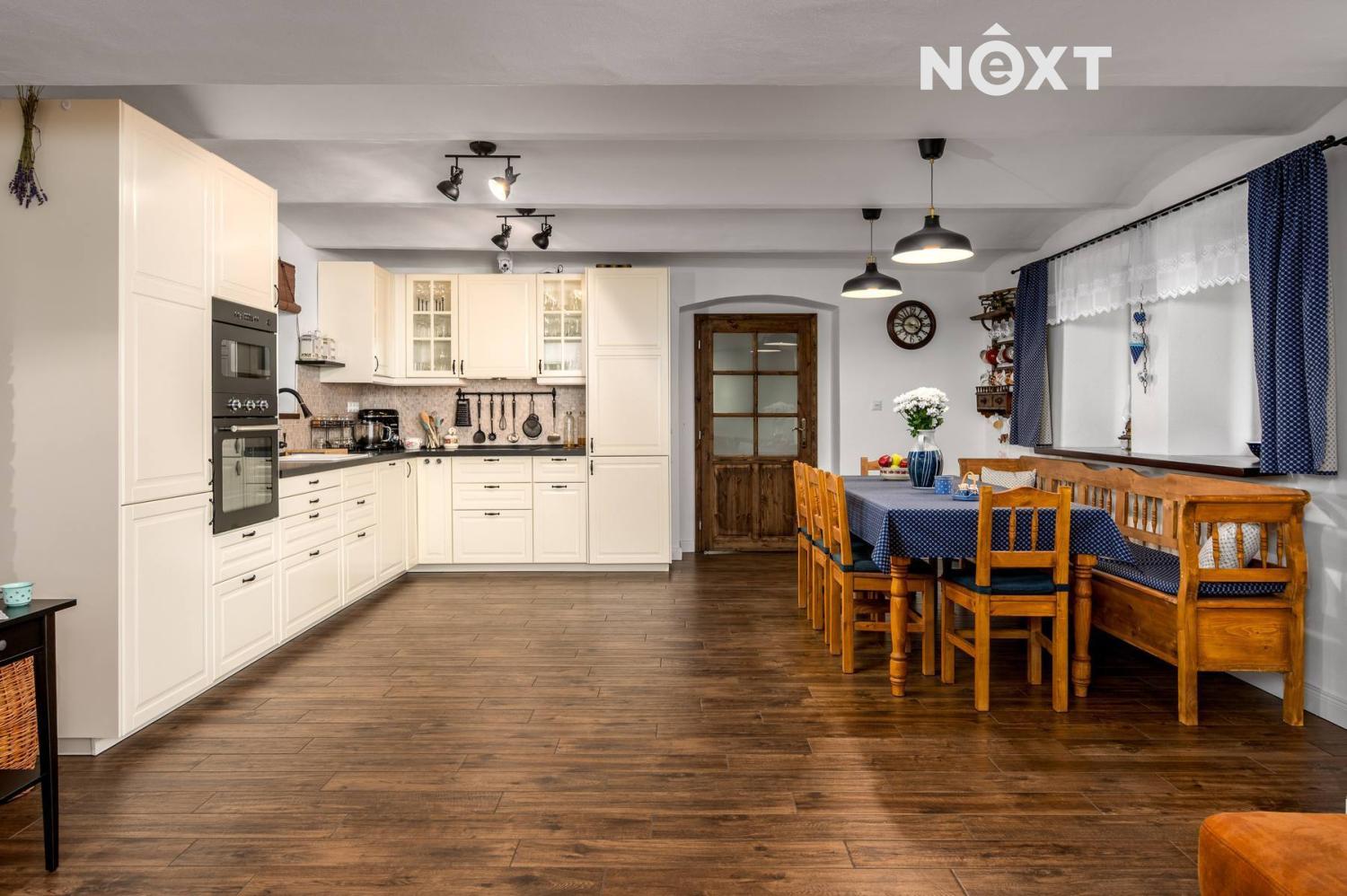 Je plně připraven k trvalému užívání – obývá se, je funkční, útulný a kompletně zařízený pro každodenní život i rekreaci. Dispozice je praktická a prostorná: tři pokoje – dvě ložnice a pracovna, světlý obývací pokoj, velká kuchyně s jídelnou, koupelna, vstupní hala, technická místnost, chodba. Obytná plocha této části činí velkorysých 130 m². Celková užitná plocha včetně sklepa a stodol je cca 200 m². Součástí fotodokumentace je i dispoziční plánek.