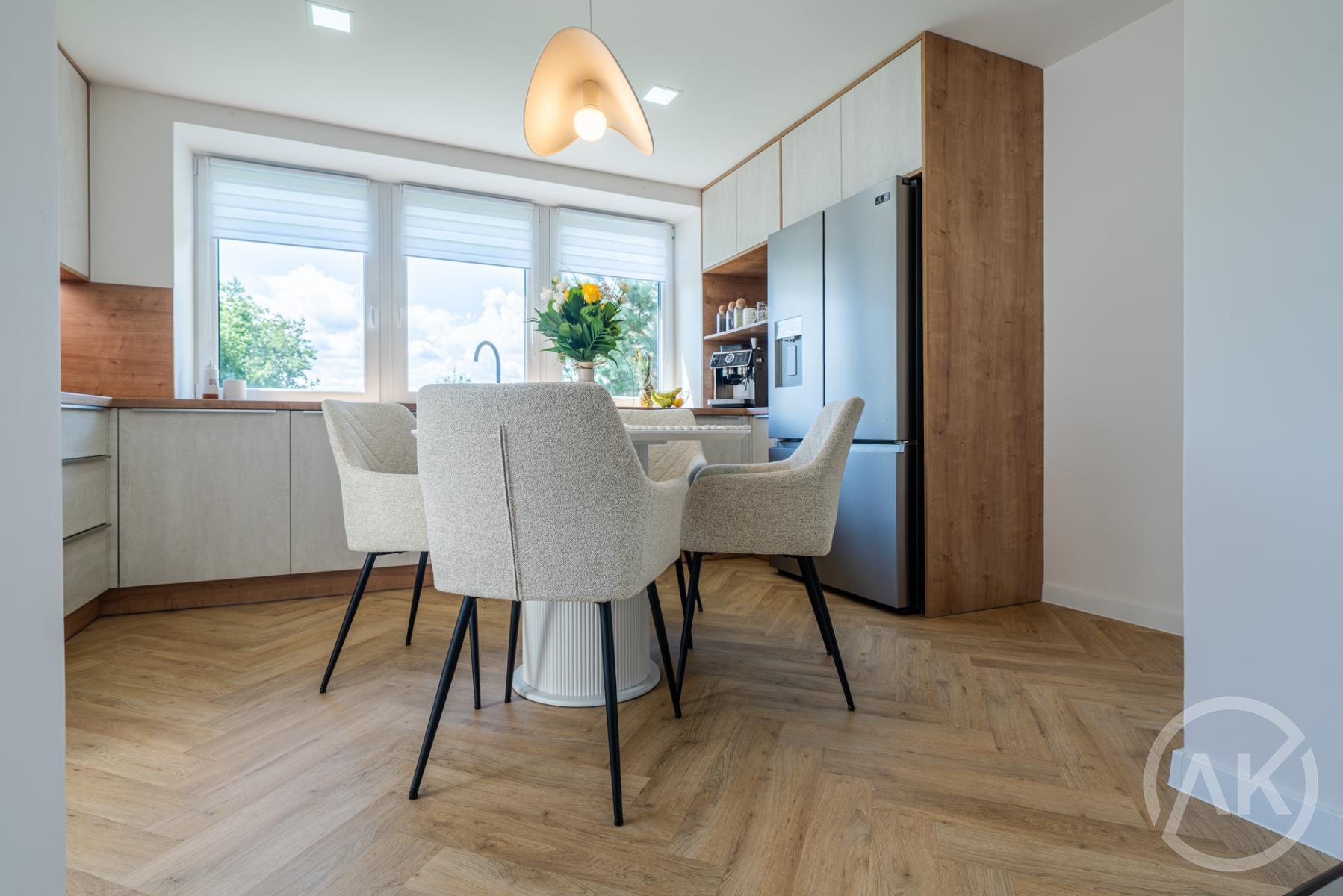 - krásnou kuchyni s kvalitními spotřebiči, širokou desku, která jde až pod okno a není tady parapet, americkou lednicí s připojením na vodu, ledovačem a výrobníkem tříště, myčku s šuplíkem (moja říkala, že bez toho je myčka děsná). Kování blum, nadstandardní dekory, vestavěný koš na tříděný odpad a indukci na 400V,