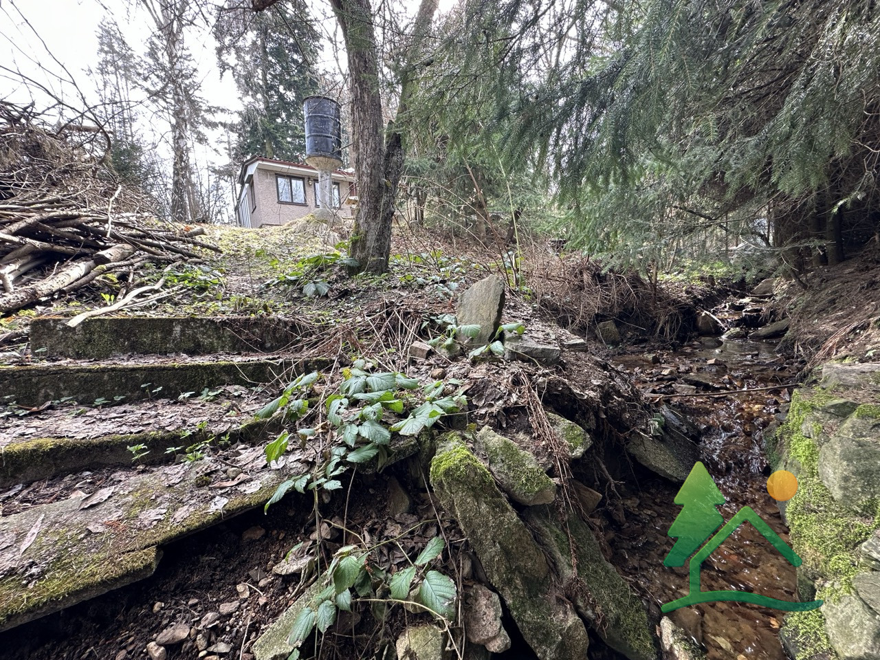 Okrajovou částí pozemku protéká malý potůček, který dodává místu jedinečné kouzlo a vytváří ideální prostředí pro odpočinek, rekreaci nebo vybudování útulného útočiště v přírodě.