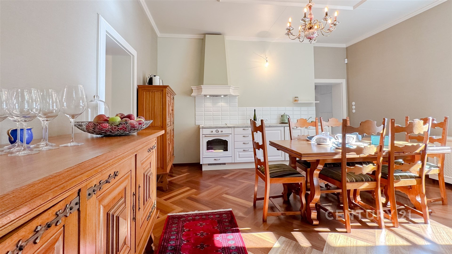 1. nadzemní podlaží je po kompletní rekonstrukci: kuchyně s jídelnou a spíží s průchodem do obývacího pokoje a salónu pro hosty, ložnice majitele, koupelna, samostatná toaleta, pokoj pro služku s vlastní koupelnou a toaletou.