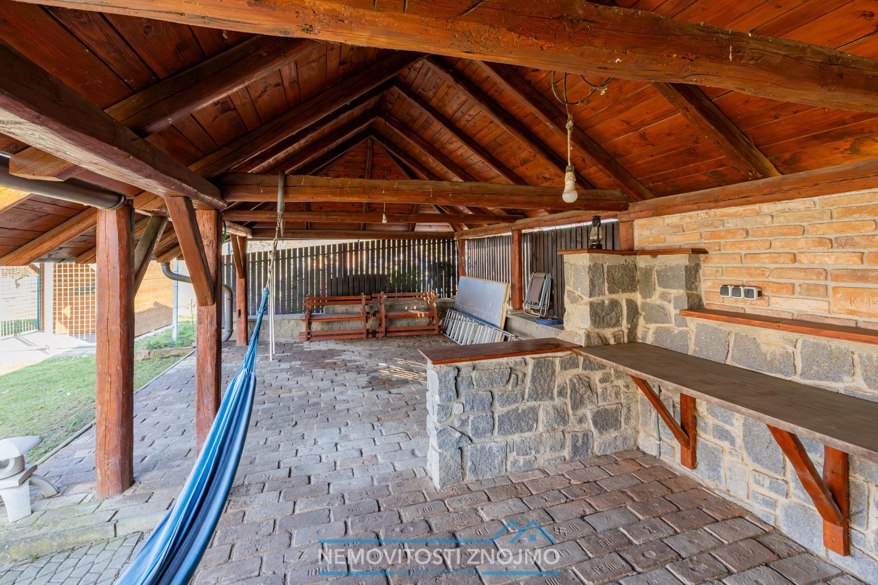 - prostorná dřevěná terasa s krbem