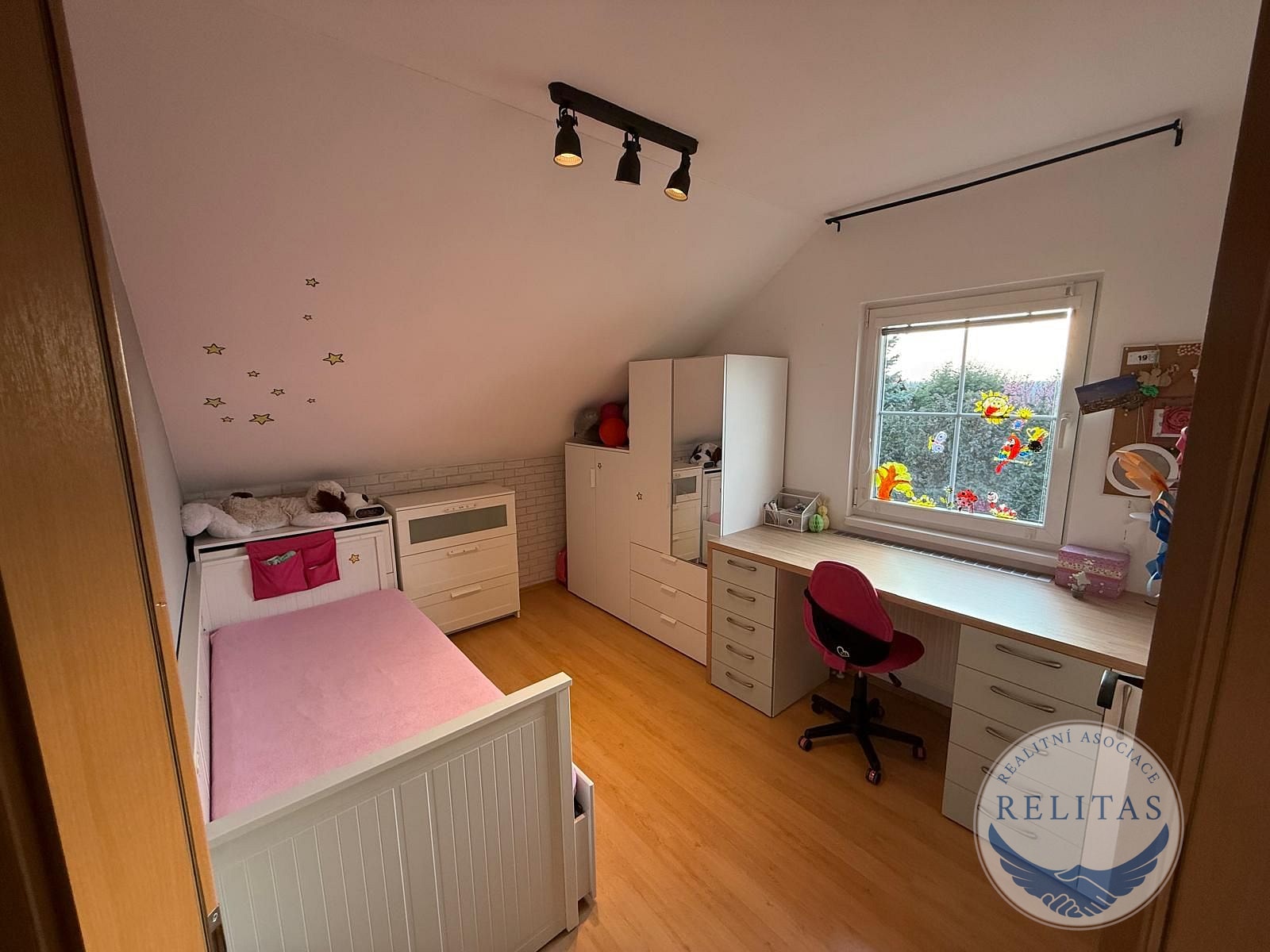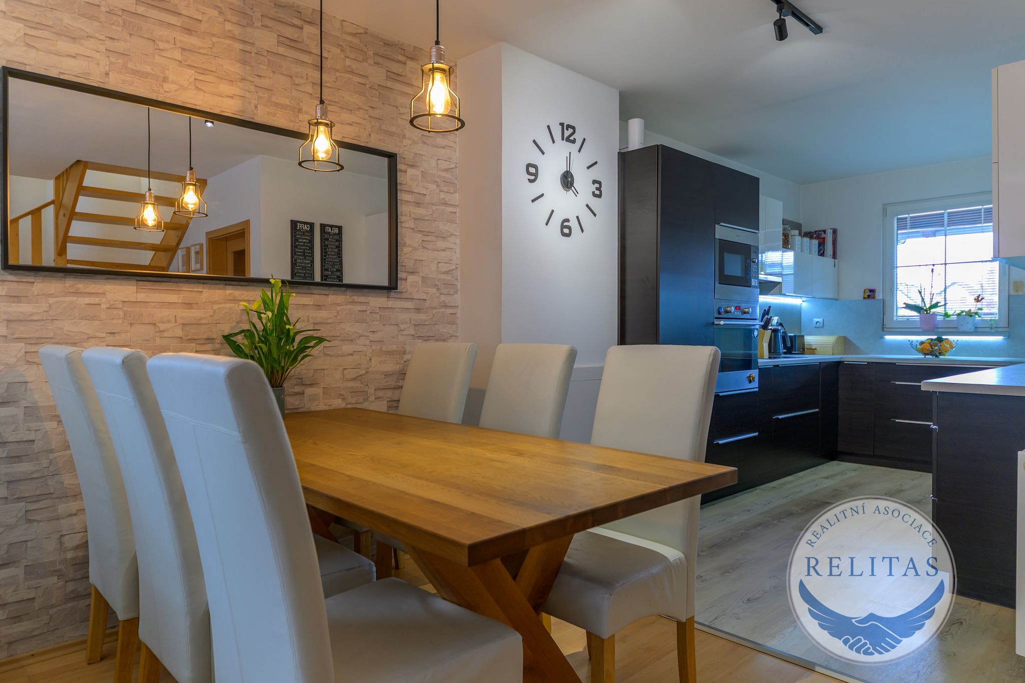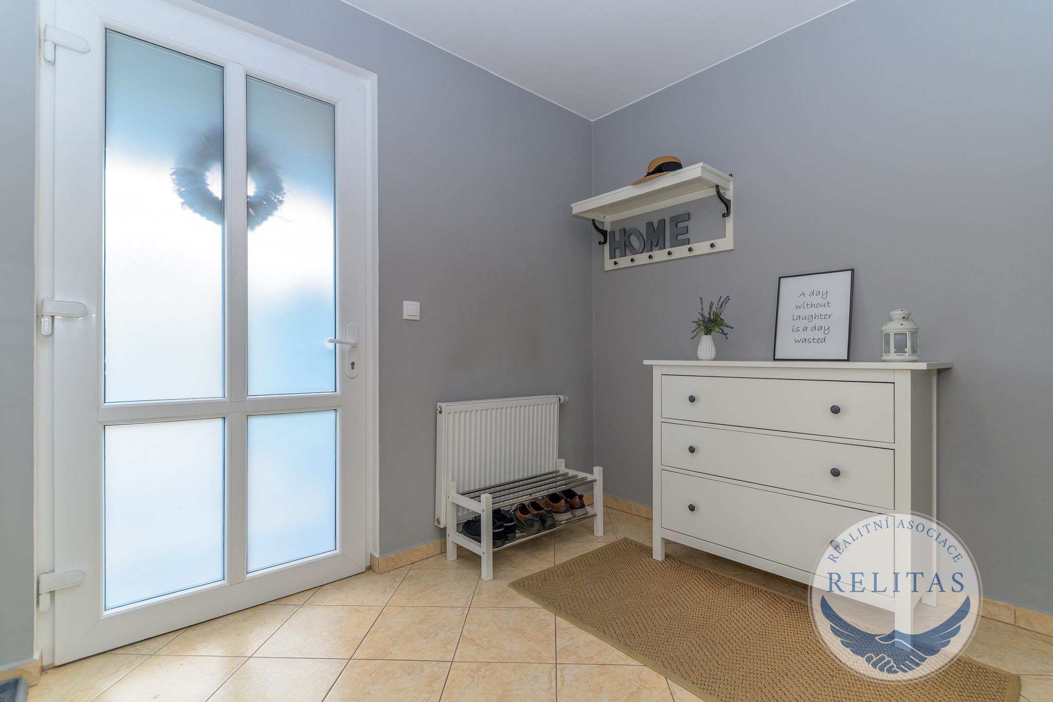 Dům nabízí praktickou a velmi dobře řešenou dispozici ideální pro rodinné bydlení. V přízemí se nachází vstupní předsíň, světlý obývací pokoj s plně vybaveným kuchyňským koutem a přímým vstupem na krytou terasu, dále samostatná toaleta. V patře je k dispozici koupelna s rohovou vanou a toaletou a tři samostatné ložnice, přičemž hlavní ložnice disponuje vlastní šatnou (viz půdorys). Další úložný prostor nabízí pochozí půda.