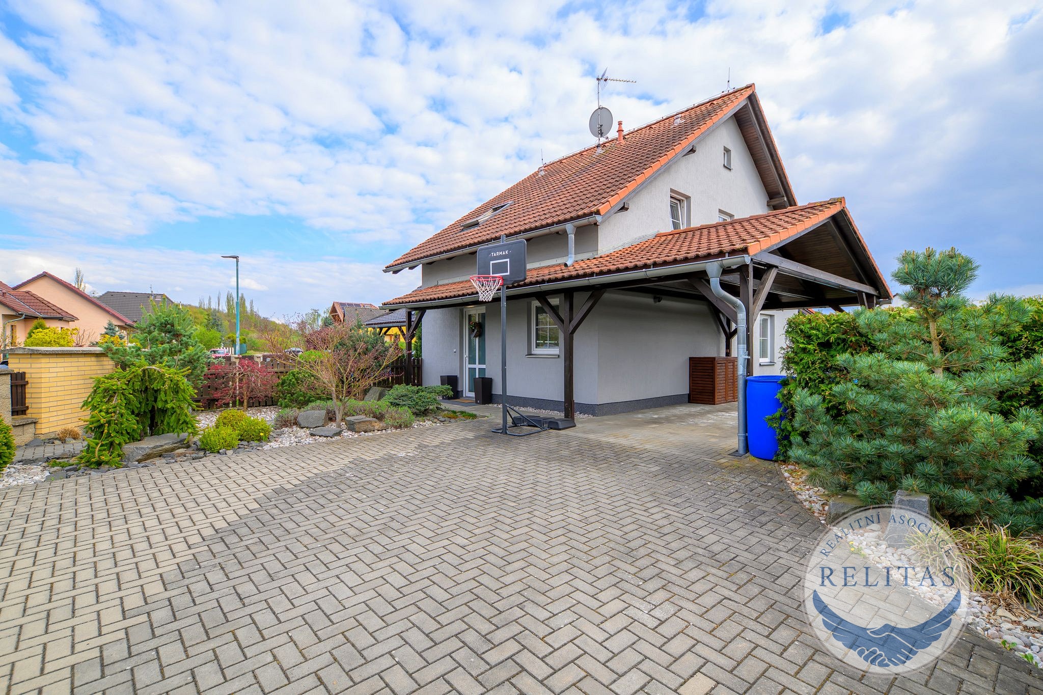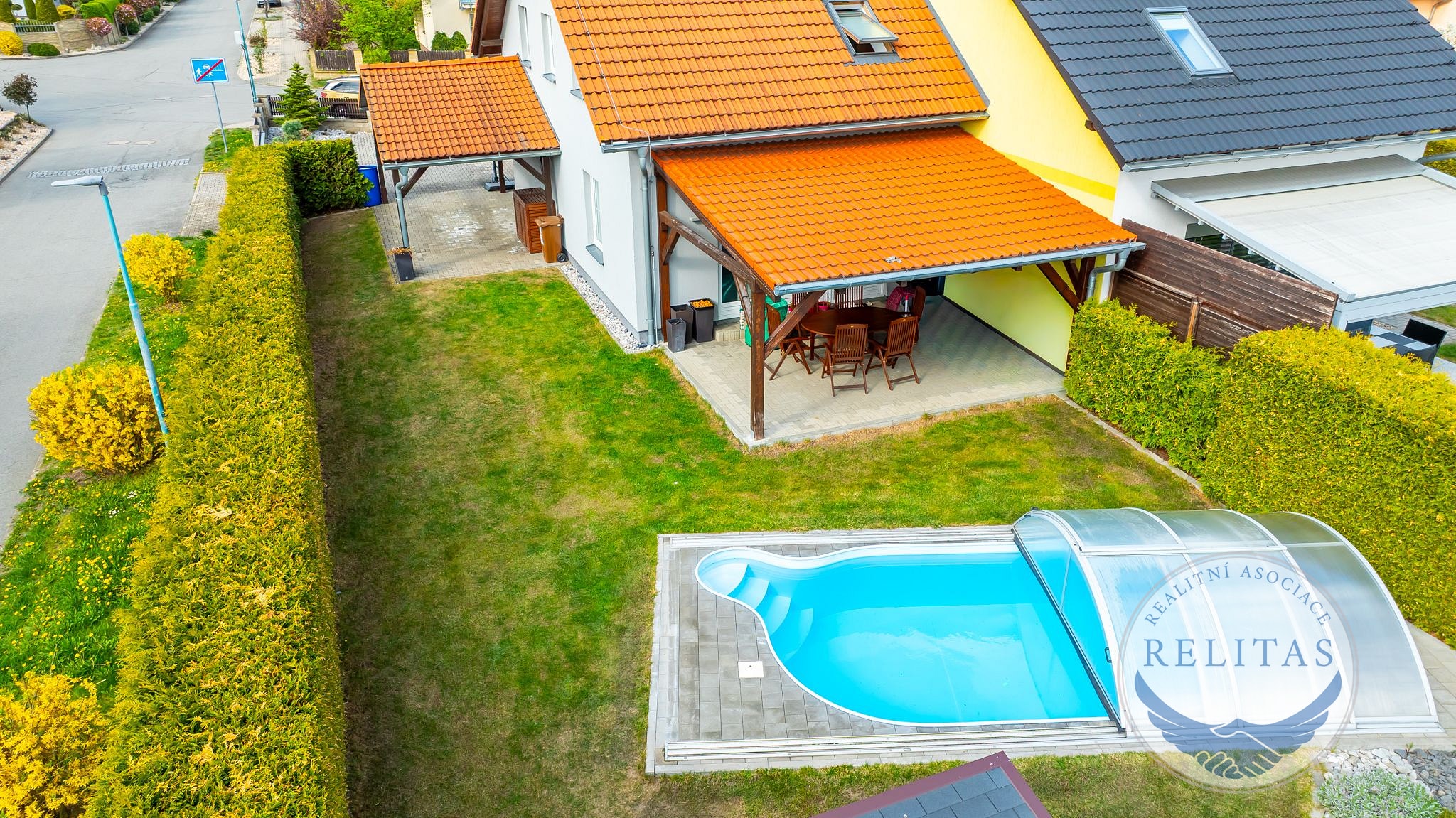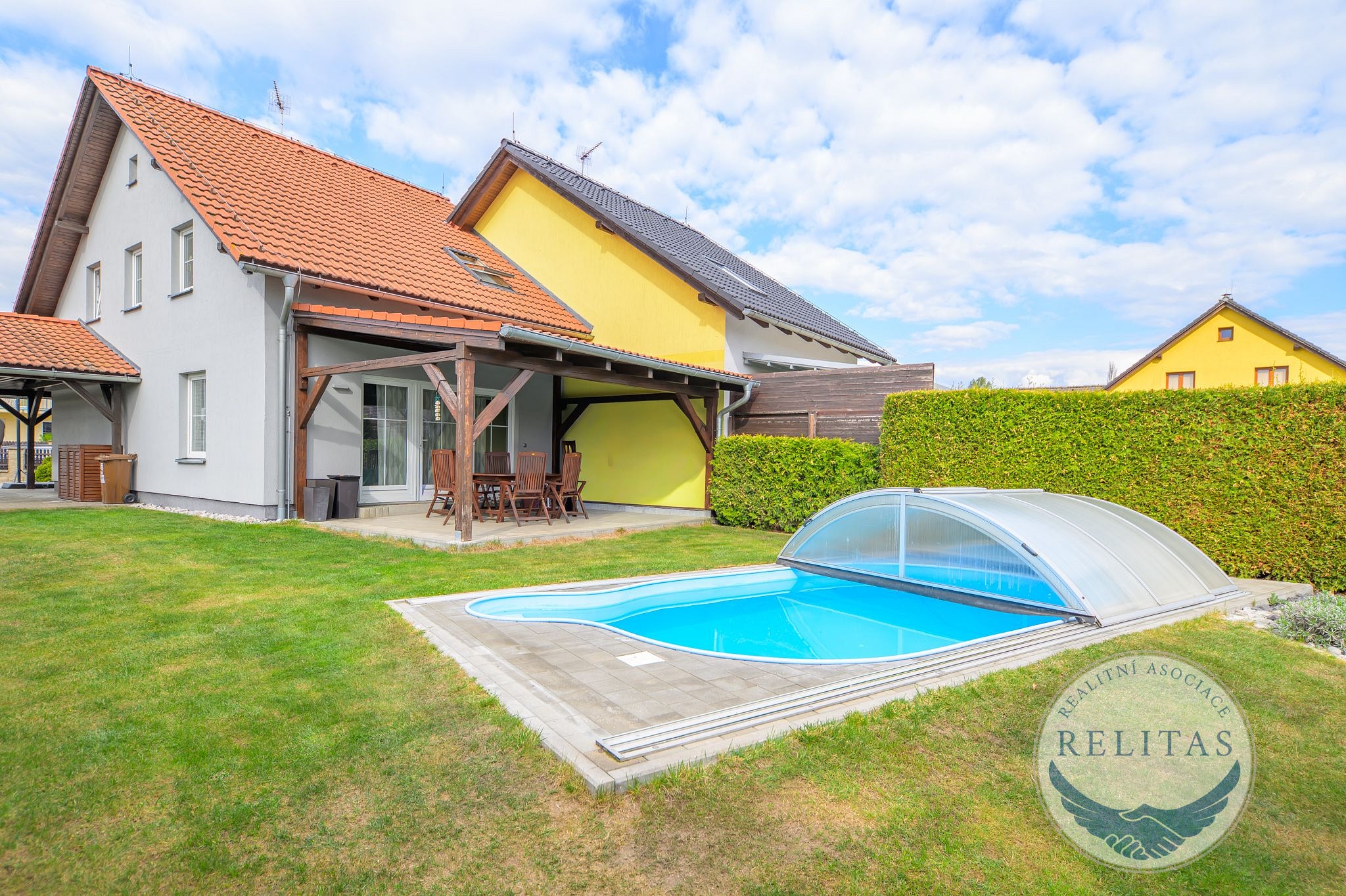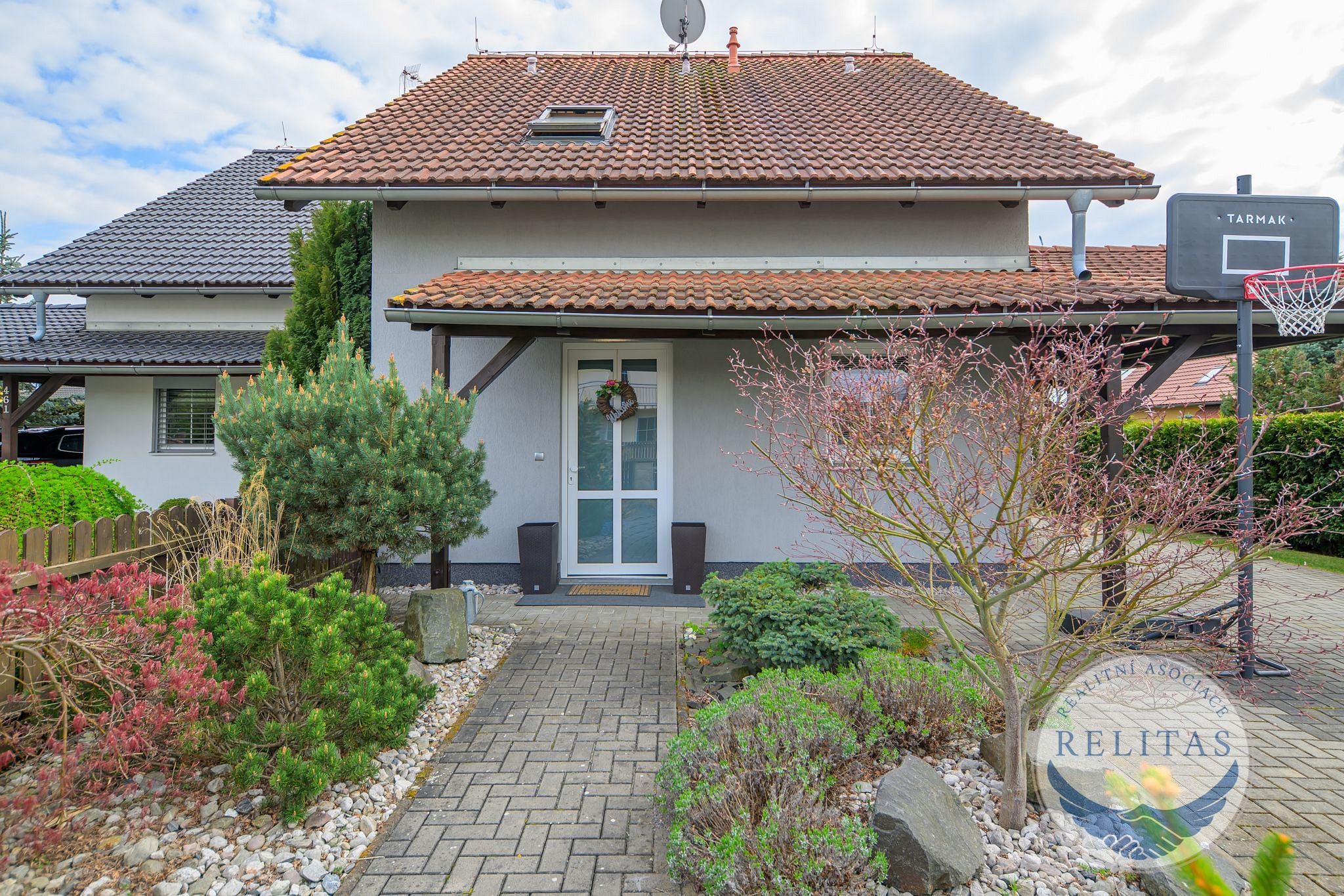 Velkým benefitem je udržovaná zahrada vybavená automatickým zavlažovacím systémem, bazénem a zahradním domkem. Parkování je zajištěno přímo na pozemku pro dva vozy, z toho jedno kryté stání.