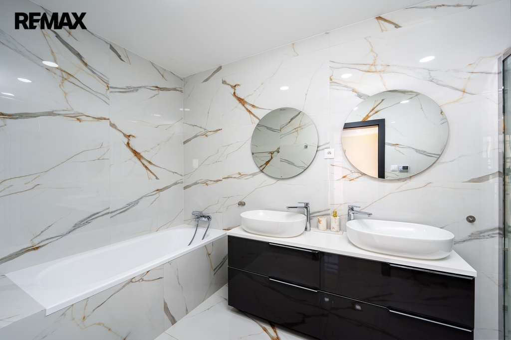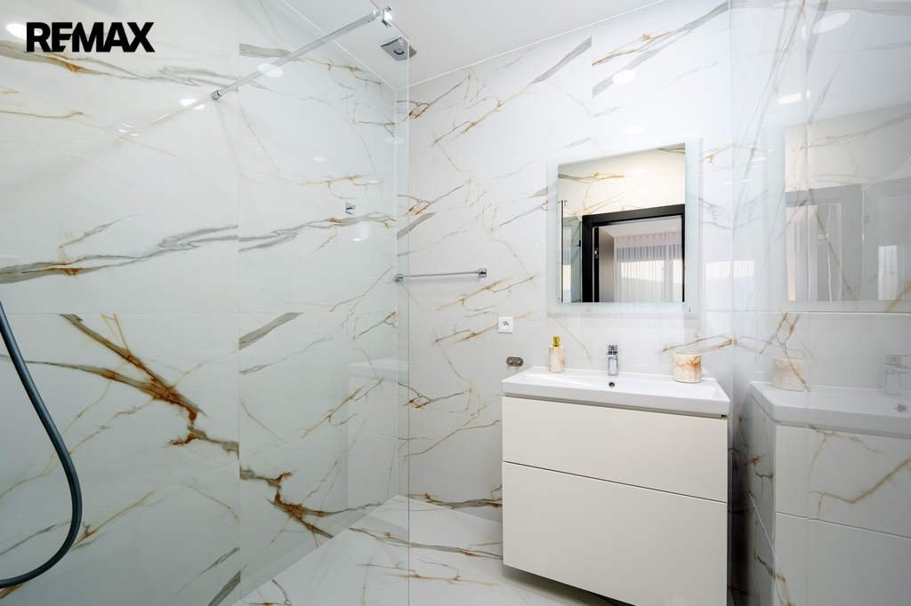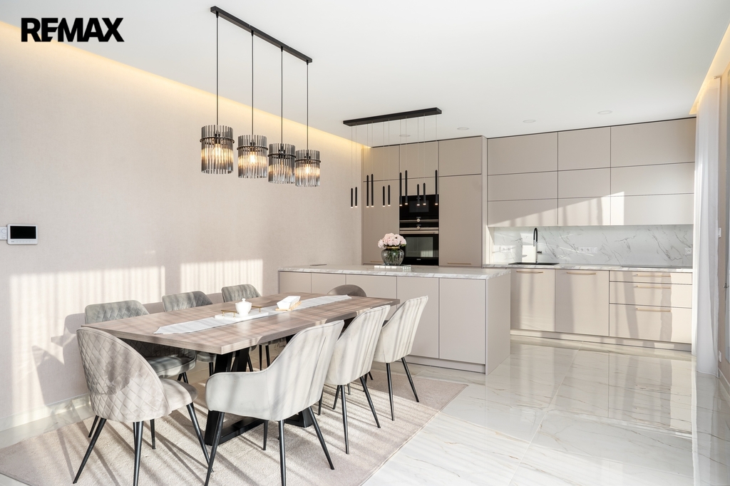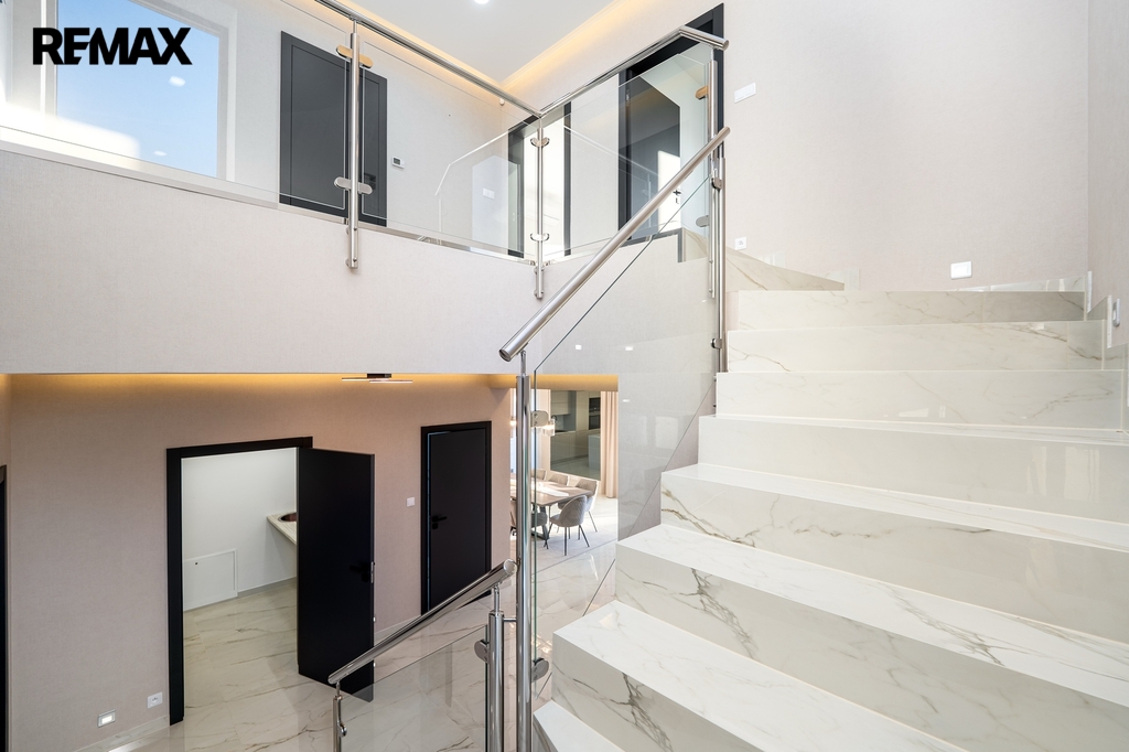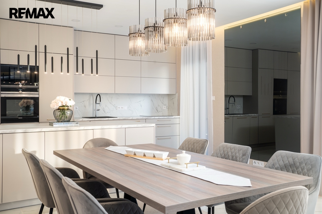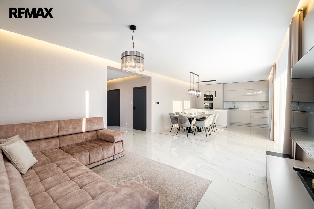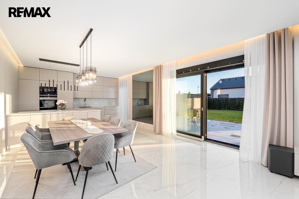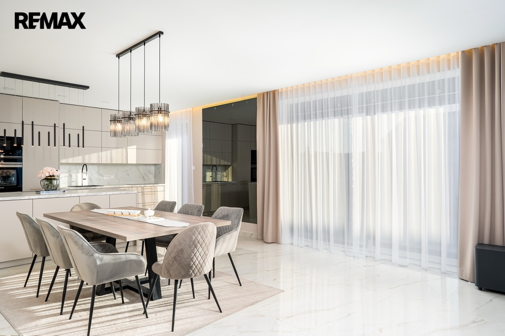 Srdcem domu je luxusní kuchyňská linka na míru, světlá, prostorná a dokonale zpracovaná, kde je radost vařit – ať už pro rodinu nebo při setkání s přáteli. Kuchyň přirozeně navazuje na obytný prostor a propojuje vaření s pohodovou atmosférou a denním světlem, které sem proudí z velkých oken.