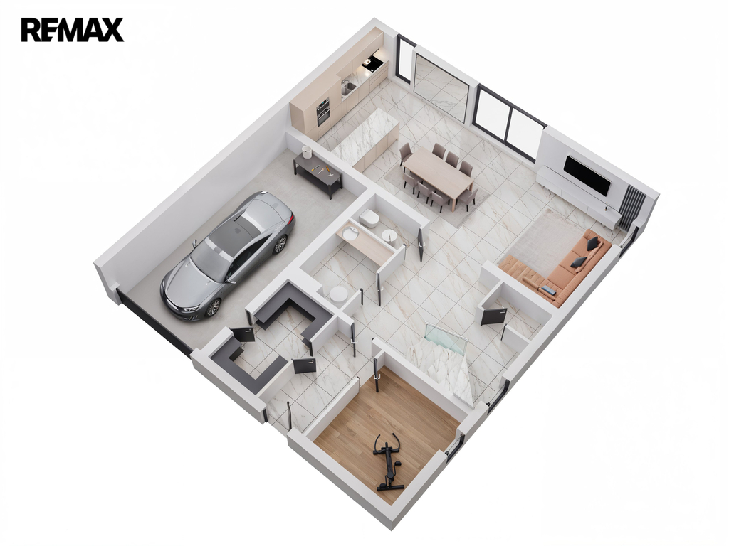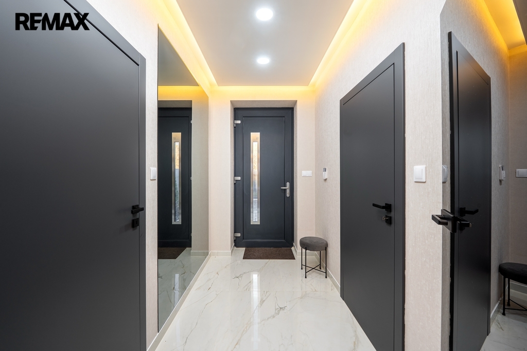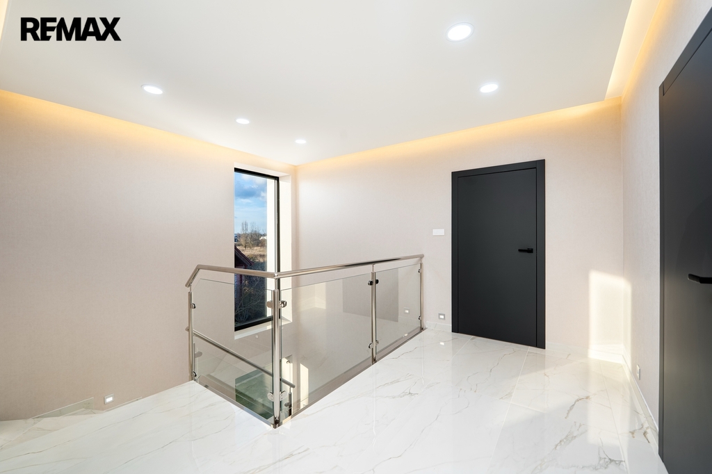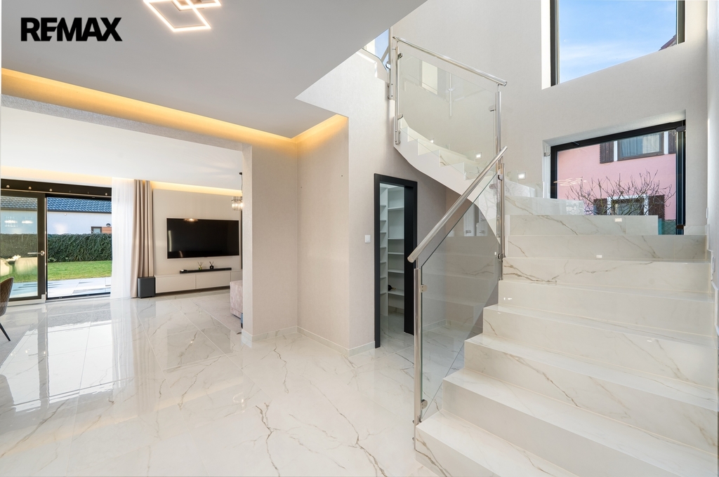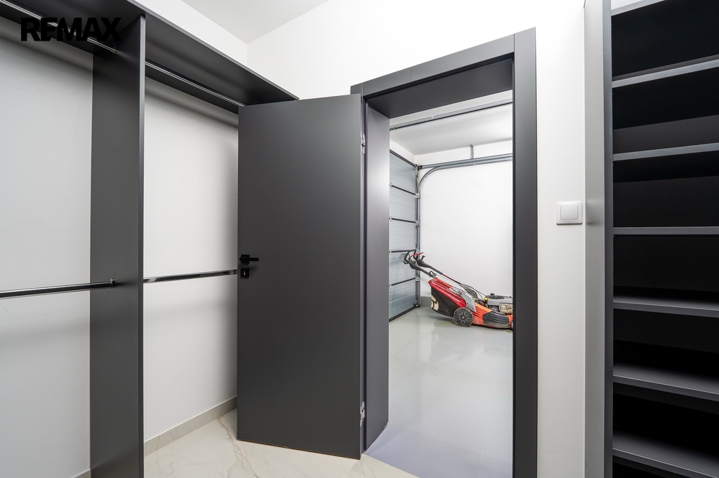 Dům je mimořádně světlý a prosluněný, s velkorysým množstvím přirozeného denního světla, které přináší do každého pokoje pocit vzdušnosti a pohody. Interiér je proveden v jemných světlých přírodních tónech, nadčasových a harmonických, které vytvářejí klidnou a příjemnou atmosféru pro každodenní život. Elegantní kontrastní černé dveře dodávají interiéru moderní nádech a zvýrazňují čistotu a světlost prostoru.