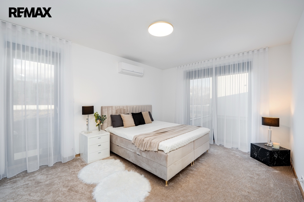 Soukromá master bedroom nabízí vlastní koupelnu, šatnu a terasu, ideální pro relaxaci, kterou lze využít například pro umístění vířivky, lehátek či posezení venku.