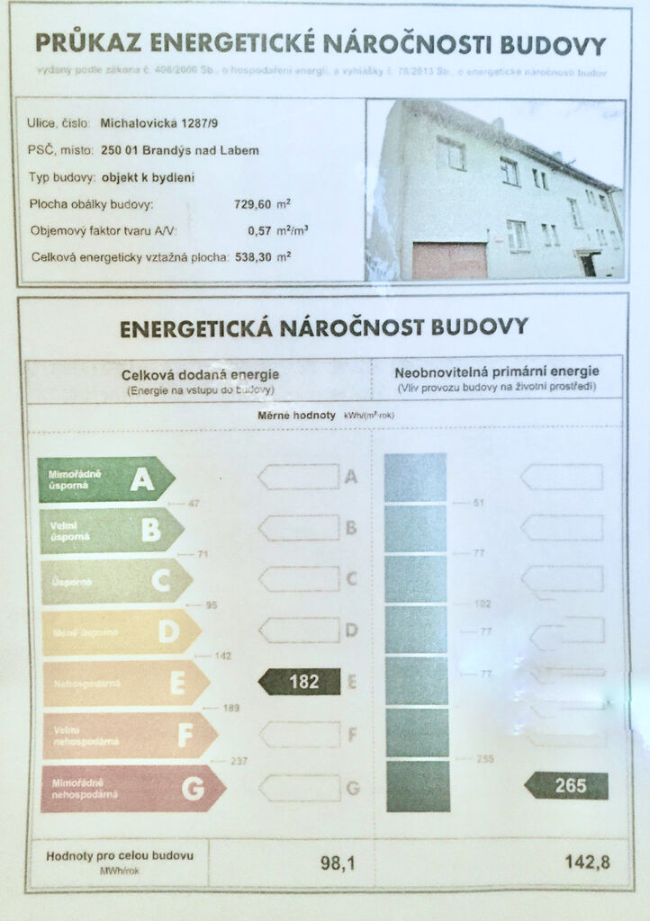 - Ukazatel energetické náročnosti budovy: 182 kWh/m²