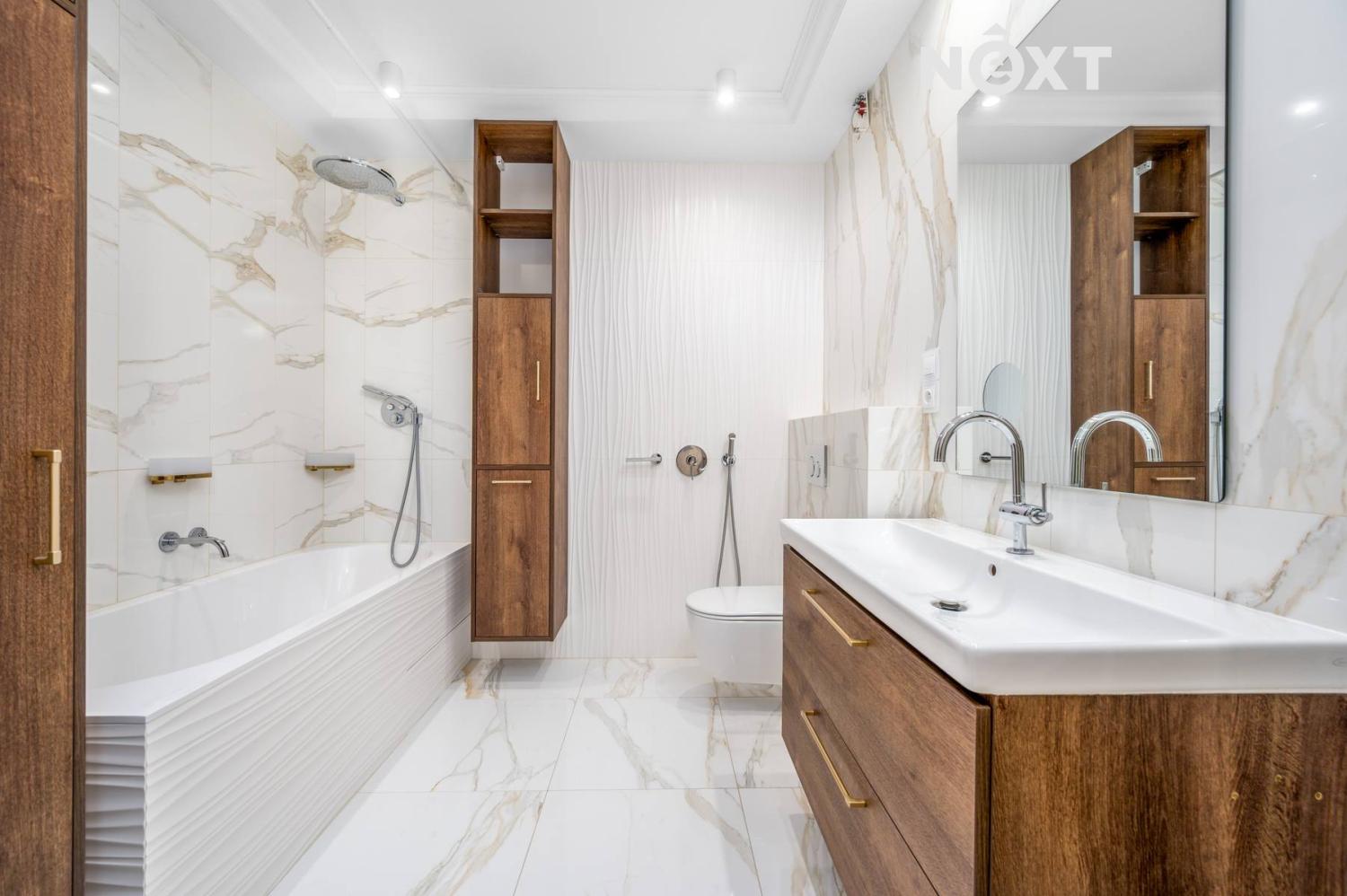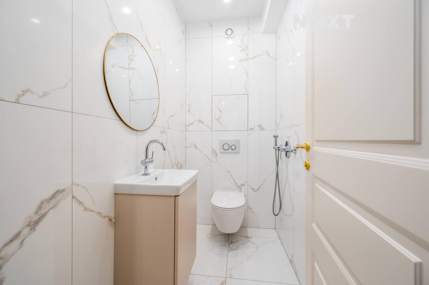Koupelna a samostatná toaleta po kompletní moderní rekonstrukci.