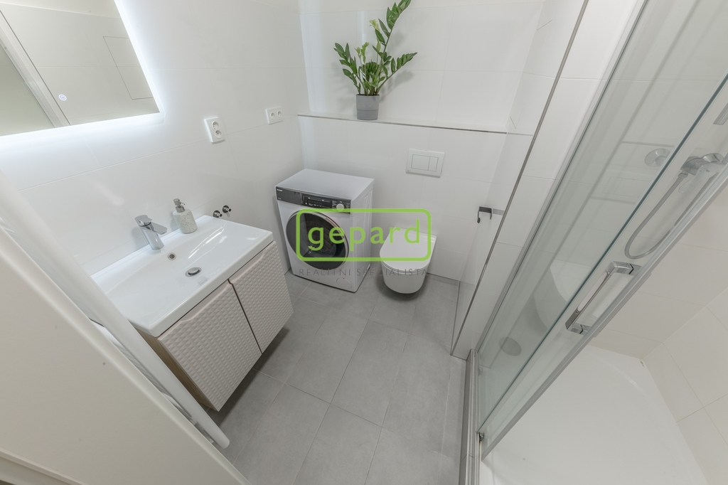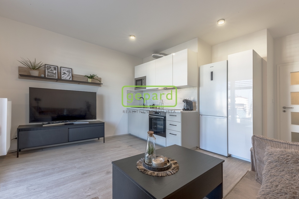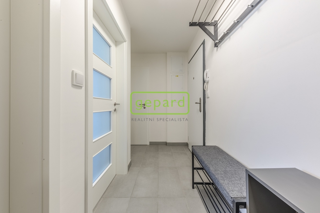 Interiér bytu je ve velmi pěkném stylu, a v prakticky novém stavu. Na podlahách je kvalitní vinyl, kuchyňská linka je osazena spotřebiči včetně varné desky, sporáku, pečicí trouby a mikrovlnné trouby.