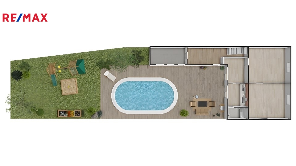 zahrada s dostatkem prostoru pro: posezení, dětské hřiště, pěstování nebo relaxaci