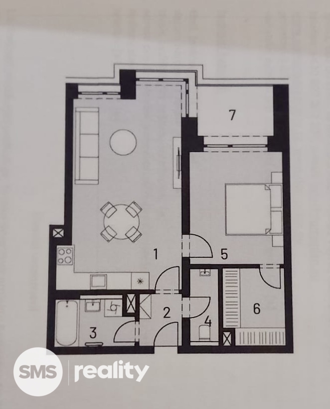 Dispozice bytu je velmi prakticky řešena, obývací pokoj s kuchyňským koutem (kuch.linka se spotřebiči - elektrická trouba, sklokeramická varná deska, digestoř, myčka nádobí, volně stojící lednice s mrazákem - vše bude instalováno v následujících týdnech), ložnice s navazující šatnou, koupelna s vanou, samostatná prostorná toaleta, chodba, lodžie s přístupem jak z obývací části tak i ložnice (výhled na udržované jezírko, které je součástí projektu a dotváří velmi příjemnou atmosféru bydlení).