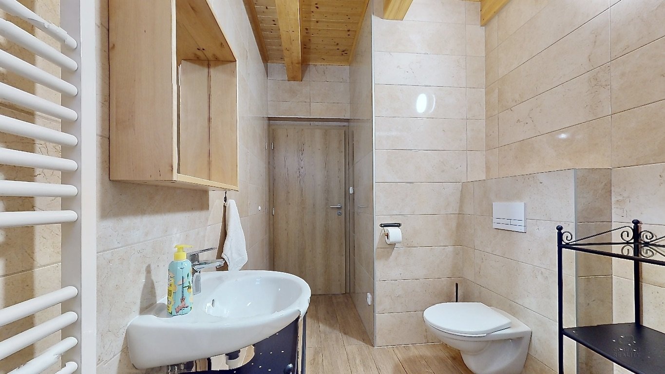 Jedná se o dispozici domu 4+kk ve dvou podlažích, kdy v přízemí se nachází prostorná chodba, lyžárna se šatnou, pokoj pro hosty, velký obývací pokoj s kuchyní, odkud je vidět na sjezdovky, dále prostorná koupelna se sprchovým koutem a pod točeným schodištěm je klidová zóna, kde si můžete přečíst knížku. V patře se nachází dva zrcadlově stejné pokoje a každý z pokojů má navíc svou vlastní koupelnu, což ja opravdu nadstandard pro rodinné bydlení.