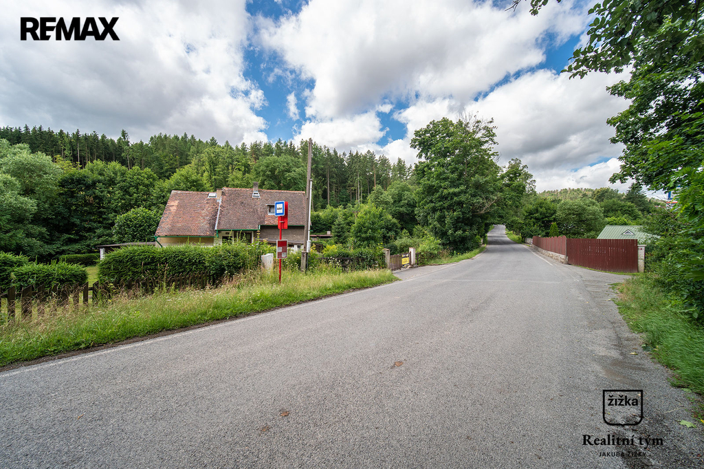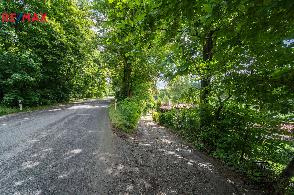 Příjezd na pozemek zajištěn z obslužné cesty podél lesa, kterou využívají ostatní uživatele okolních rekreačních chat - cesta není vhodná pro vjezd těžké techniky.