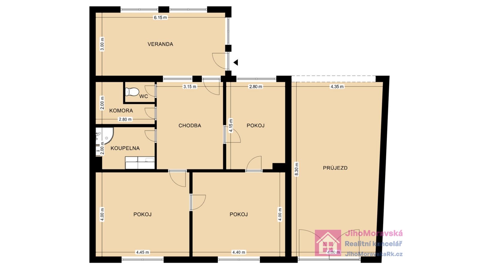 Dispozice domu: předsíň, chodba, toaleta, komora, koupelna (sprchový kout), tři pokoje (jeden průchozí). Pod domem se nachází menší vinný sklep.