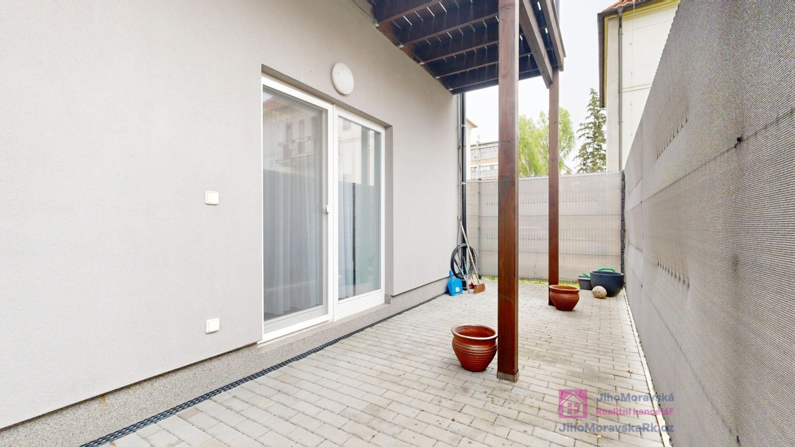 předsíň, pokoj, jídelna s kuchyňským koutem, koupelna s WC (sprchový kout), pokoj s přímým vstupem na terasu.
