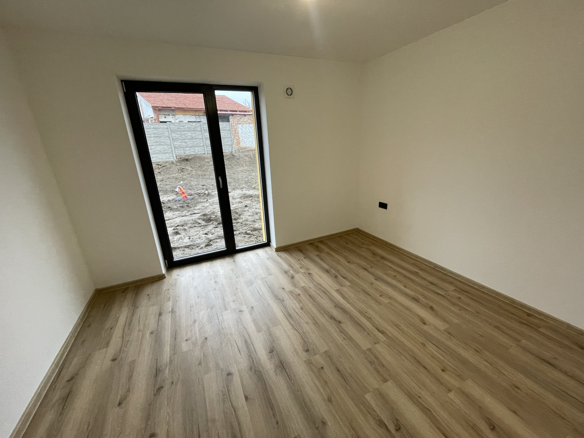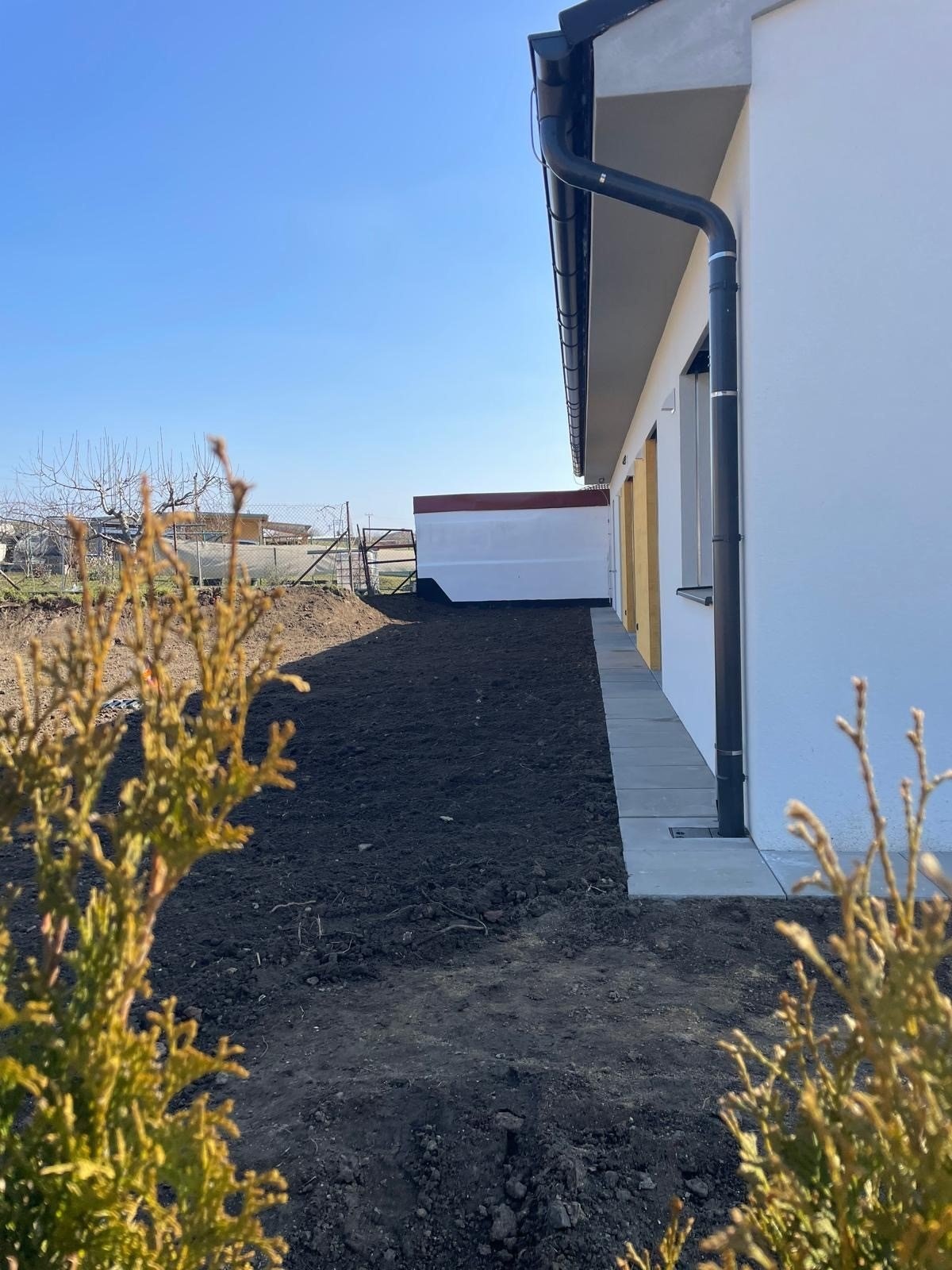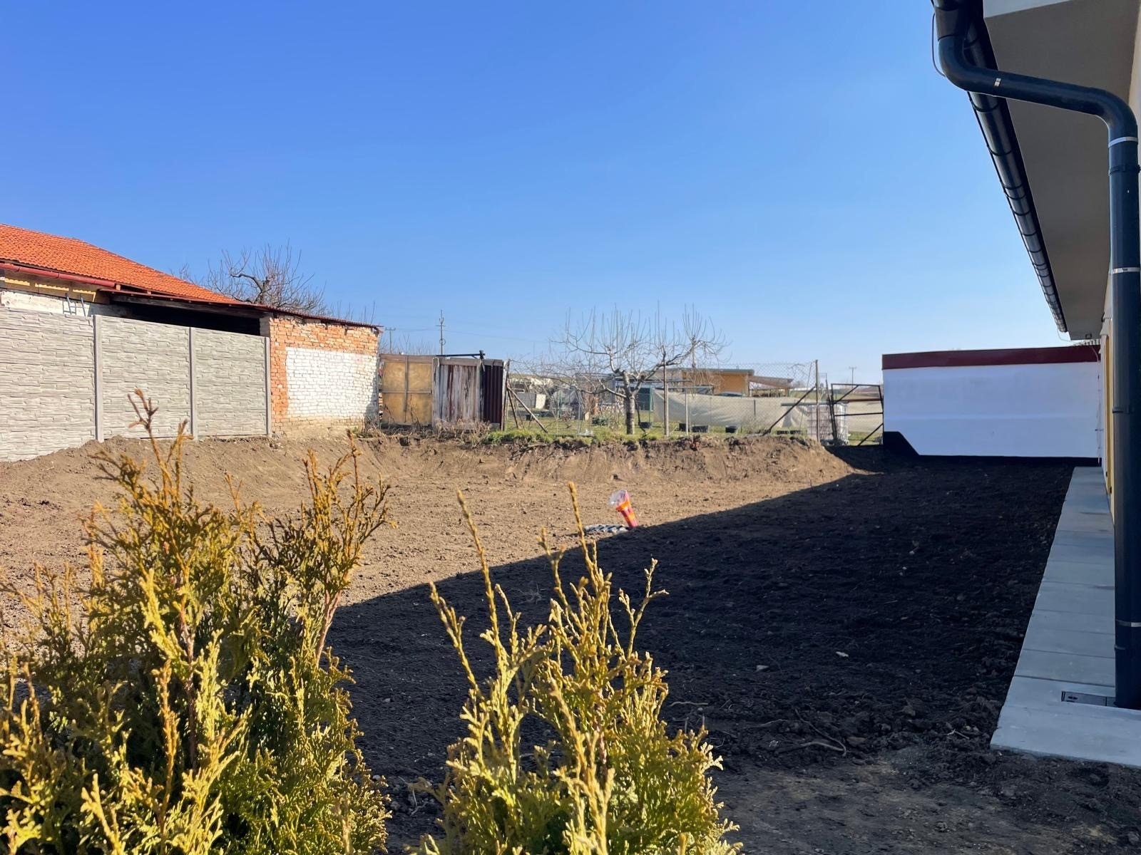 Zahrada s budoucí terasou je přístupná z garáže, z ložnice i z obývacího pokoje.