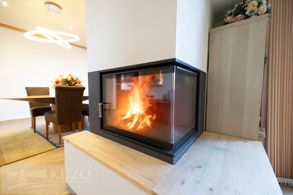 Vytápění zajišťuje elektrický kotel s podlahovým topením, doplněný krbem na dřevo, el. krbovými kamny.