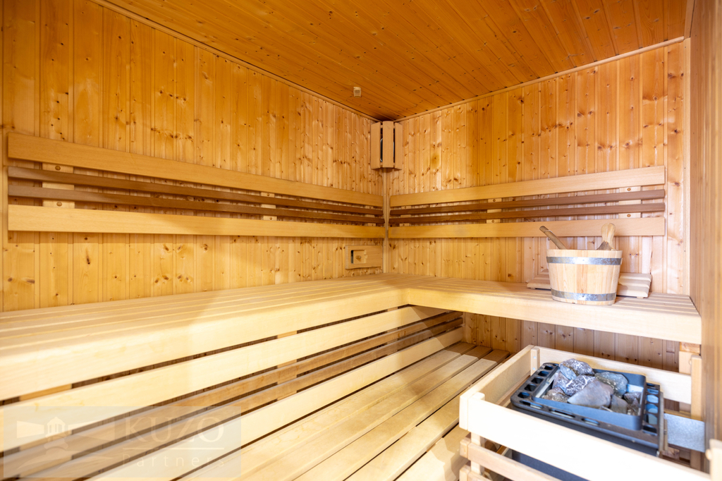 V přízemí (126,17m2) se nachází vstupní chodba s šatní skříní a botníkem, prostorný obývací pokoj s krbem, jídelna s kuchyňským koutem s vestavěnými el.spotřebiči, samostatné WC, prostorná šatna s úložným prostorem pod schodištěm, ložnice s šatnou, koupelna se sprchovým koutem, WC, 2xumyvadlo, sauna, technická místnost.