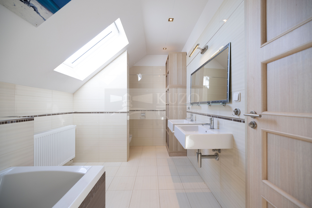 V podkroví ze tří ložnic vznikl jeden členitý otevřený pobytový prostor (57,42m2) se vstupem na terasu 18,04m2, koupelna a WC, lze uvést do původního stavu.