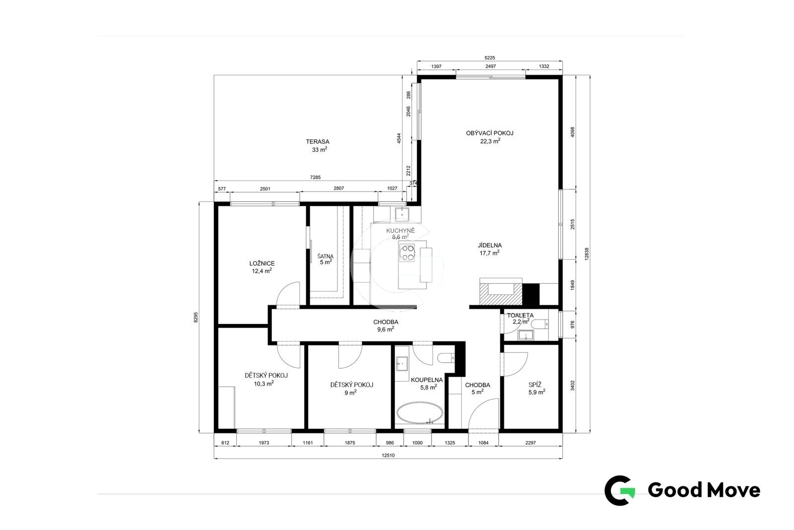 • jednou samostatnou toaletou a druhou, která je součástí koupelny