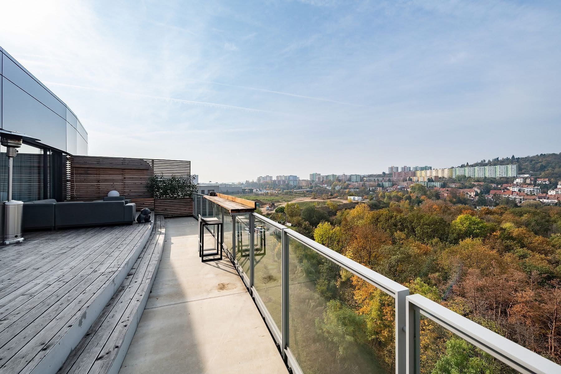 Dominantou bytu je dřevěná terasa 58 m² s posezením a grilem, která nabízí dostatek prostoru pro relaxaci, dětský venkovní koutek či umístění vířivé vany a výrazně rozšiřuje obytný prostor.