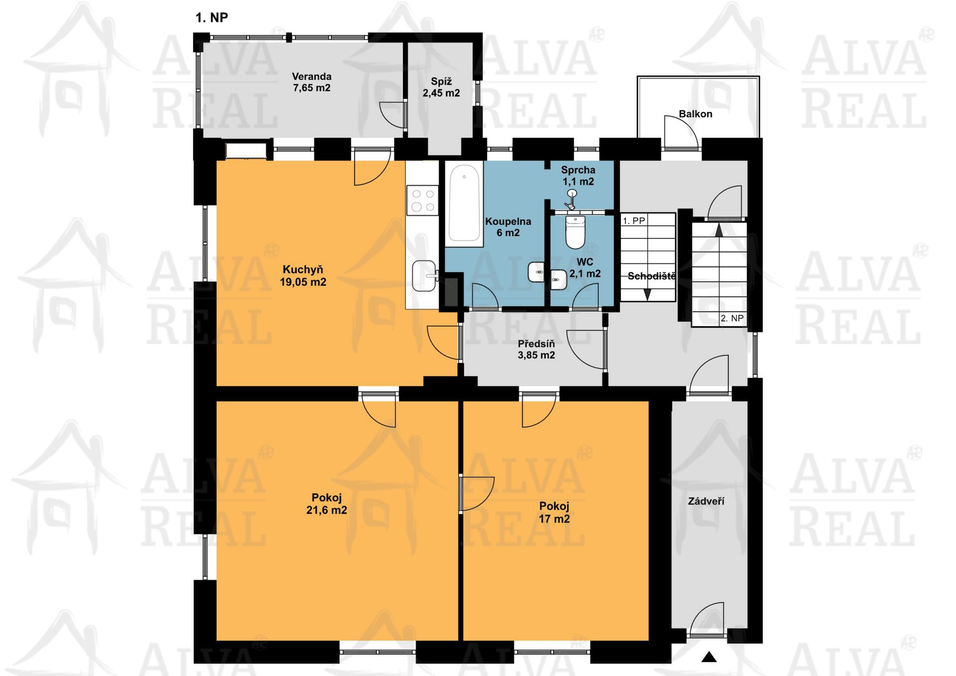 2. NP: současně byt 3+1: 2 neprůchozí pokoje + 1 průchozí pokoj, všechny s parketami a kobercem; kuchyně s kuchyňskou linkou a plynovou varnou deskou, příprava pro myčku; koupelna s WC, sprchou a vanou; zimní zahrada; spíž.