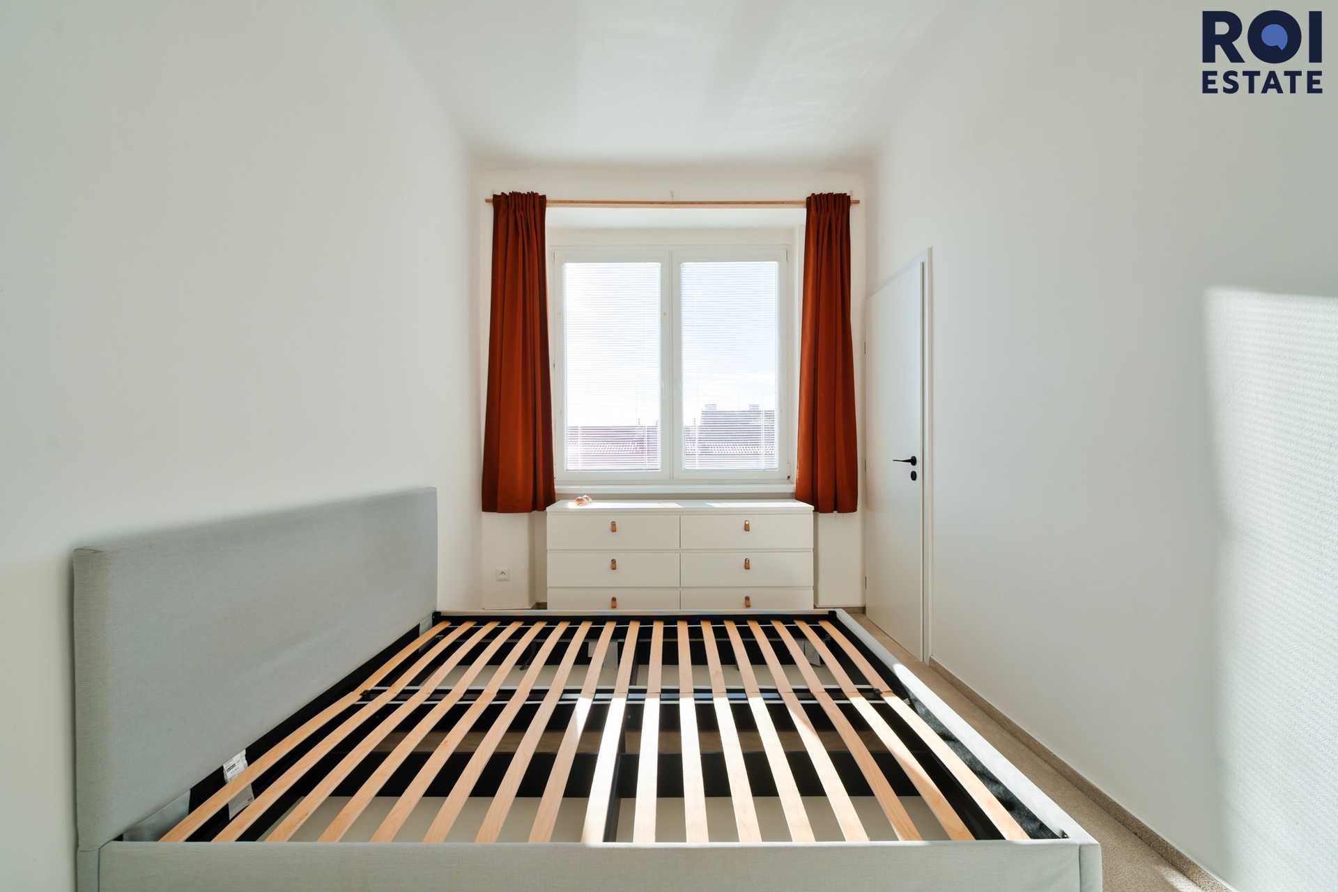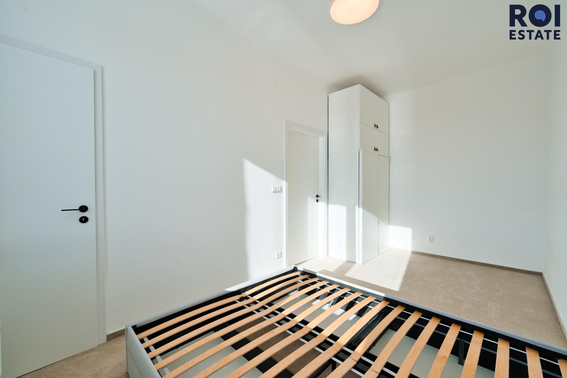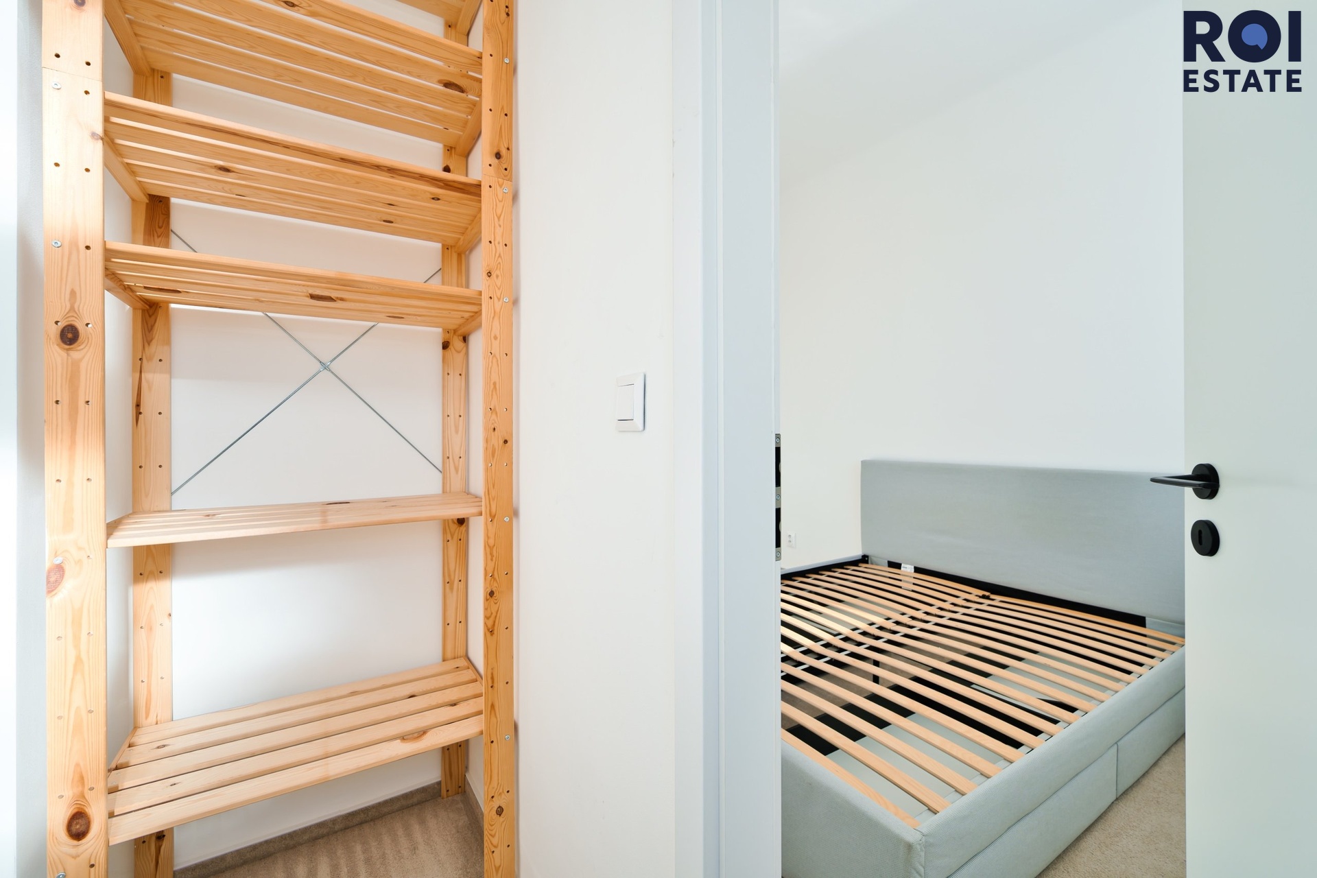 Ložnice s postelí a úložnými prostory, komora, kterou lze využít i jako šatnu nebo pracovnu.
