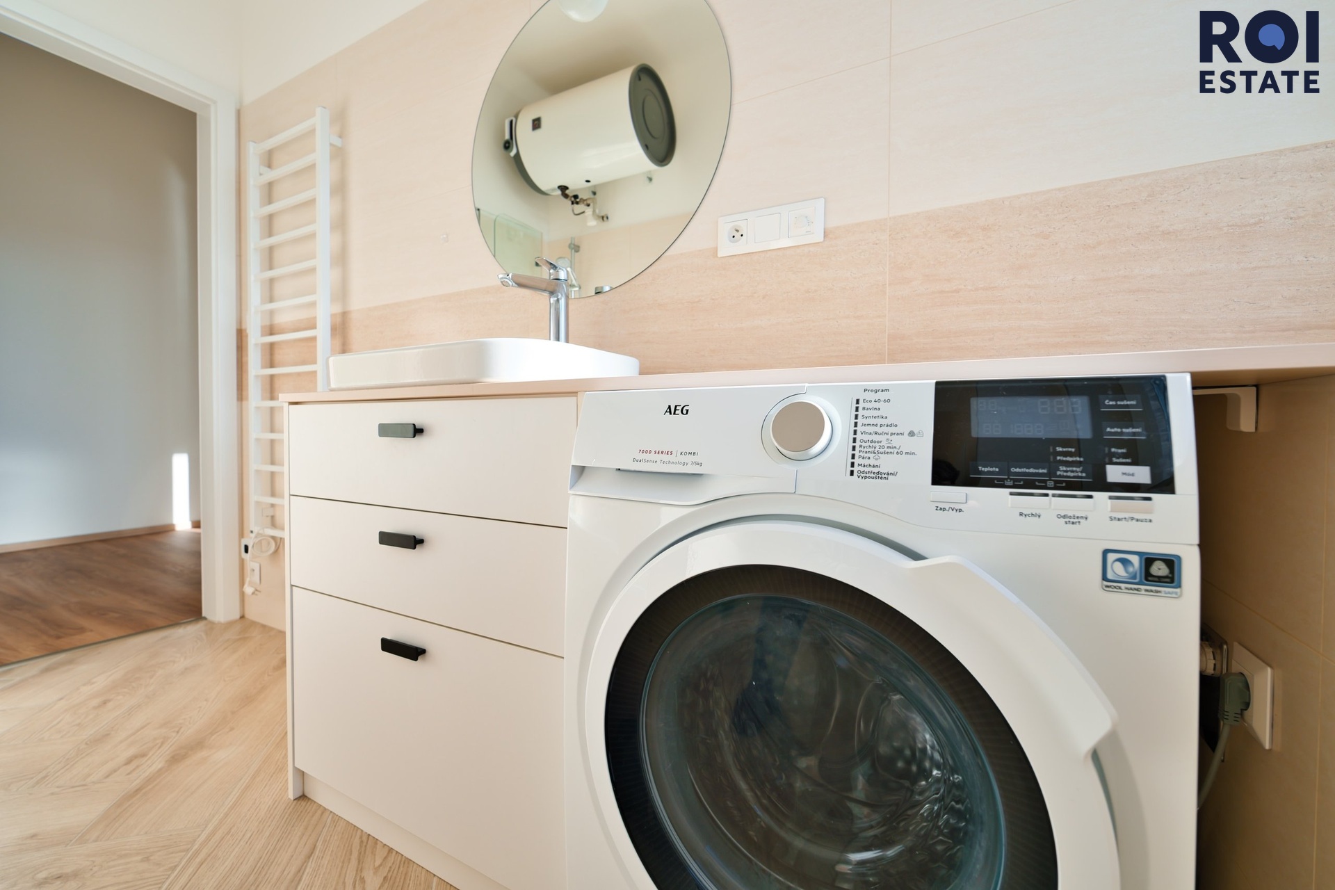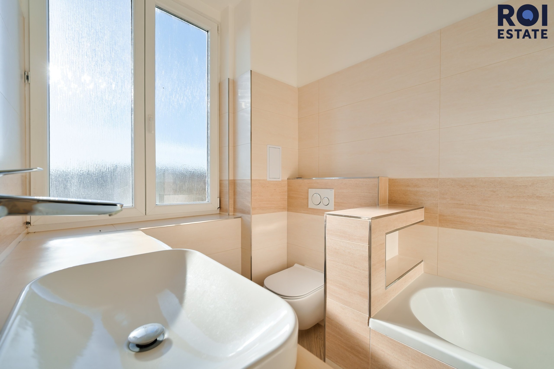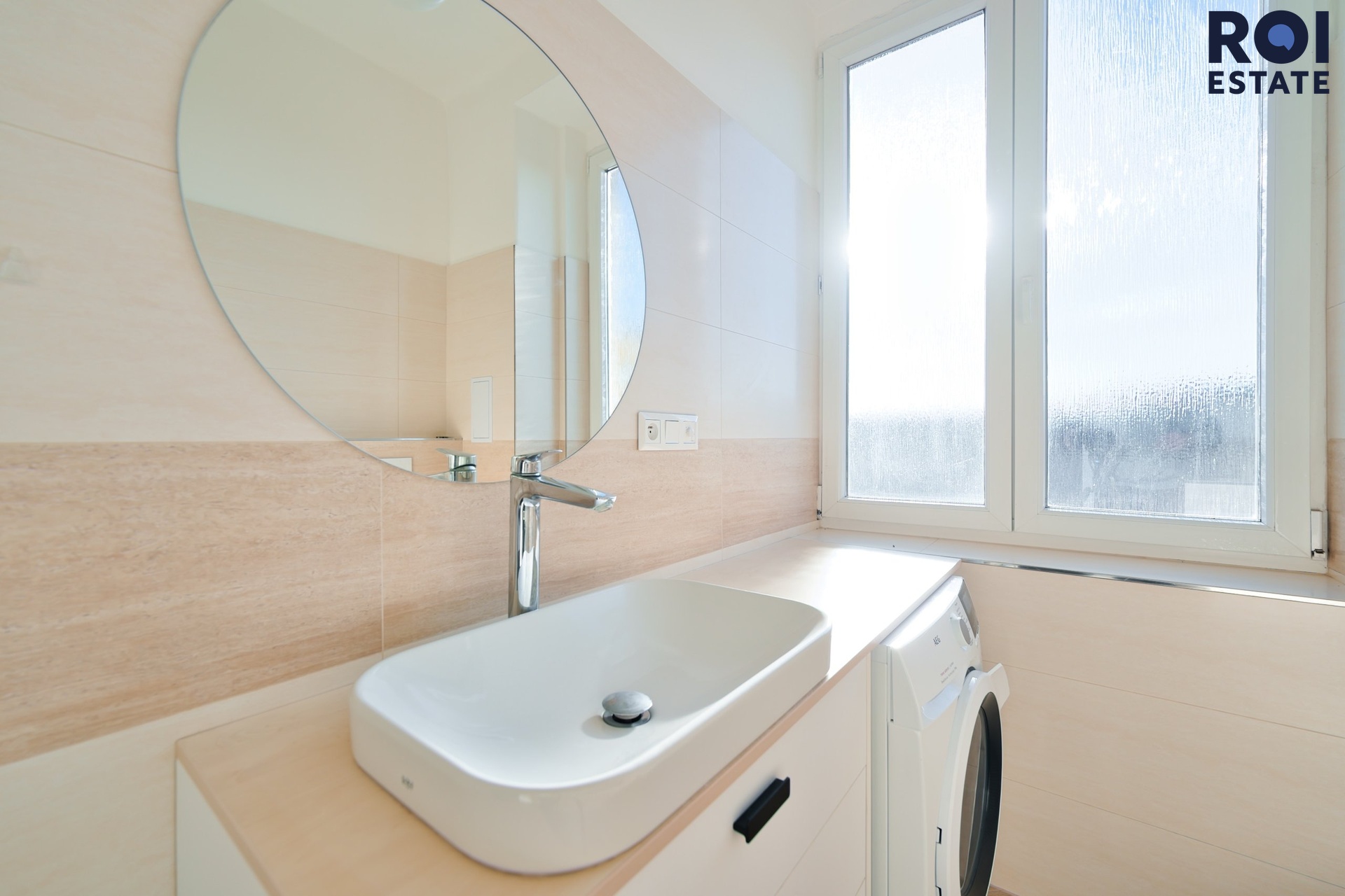 Koupelna je s oknem, vybavená pračkou kombinovanou se sušičkou, vanou.