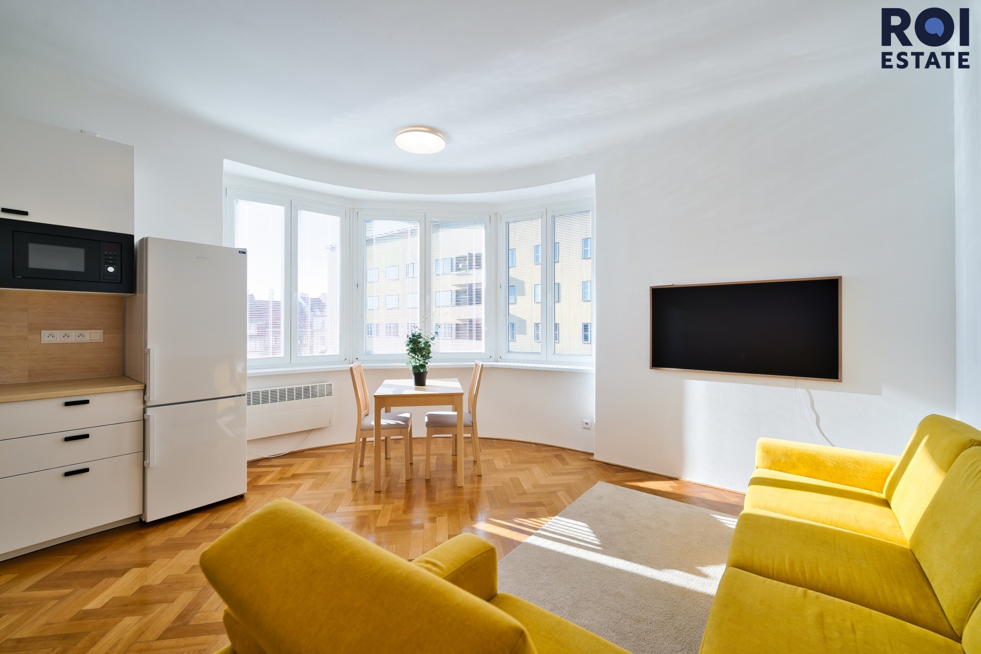 Obývací pokoj propojený s kuchyňským koutem, s krásným obloukovitým oknem a výhledem.