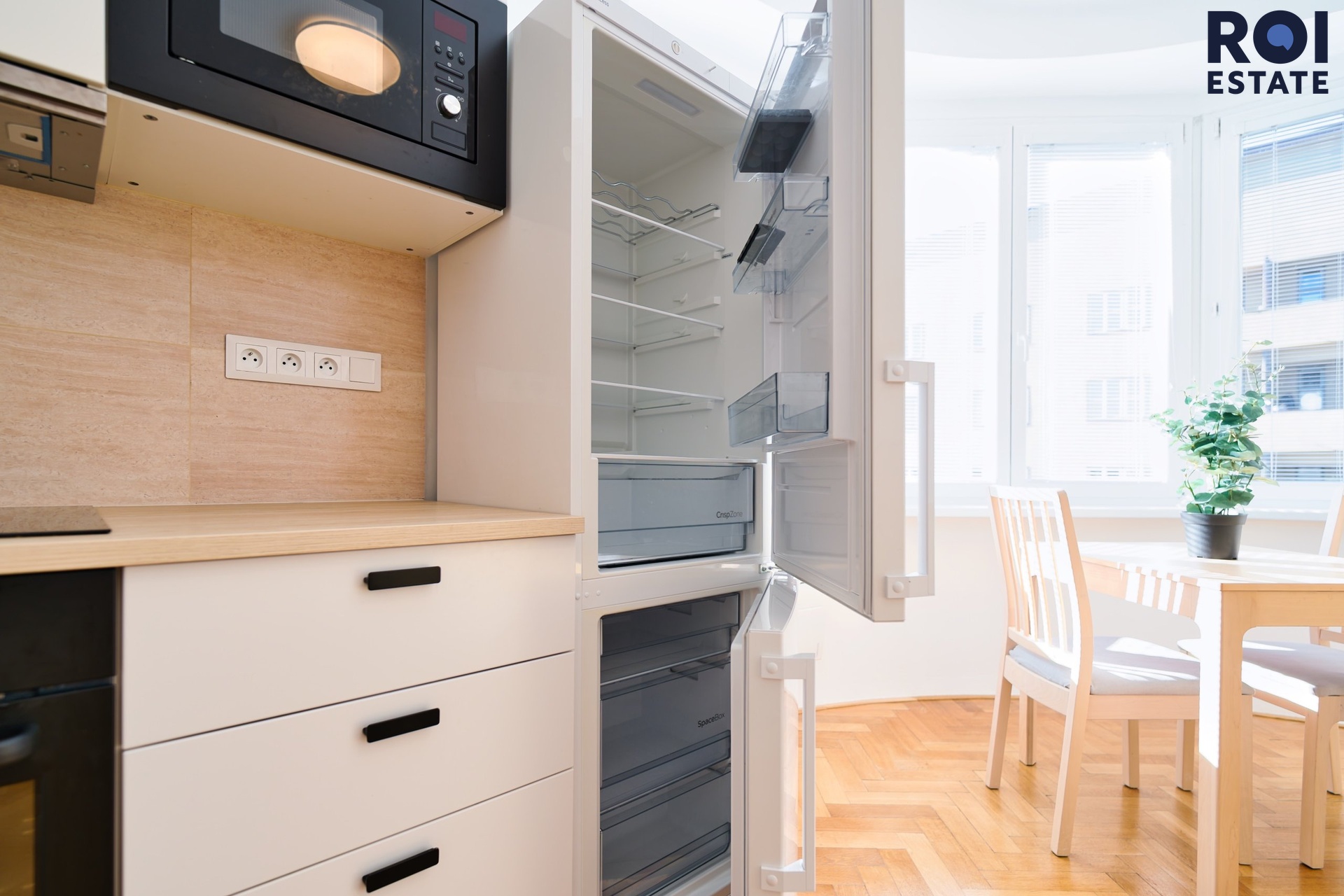 Kuchyňská linka v příjemných barvách, vybavená standardními spotřebiči.