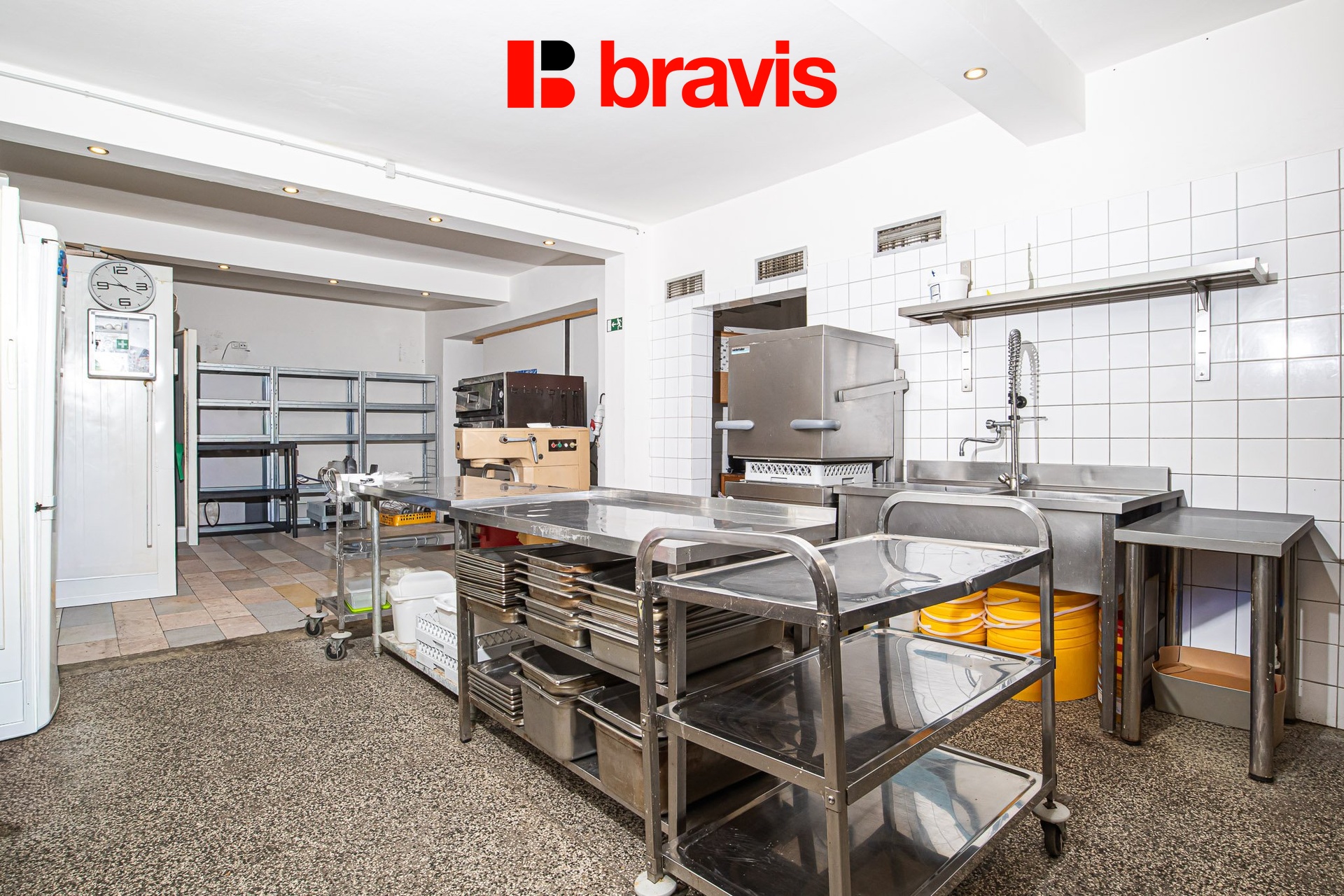 Součástí pronájmu je prostorná kuchyně o velikosti 68 m², která je plně vybavená a technologicky připravená na výrobu 150–200 obědů denně, vhodná jak pro klasickou restauraci, tak pro polední menu či catering.