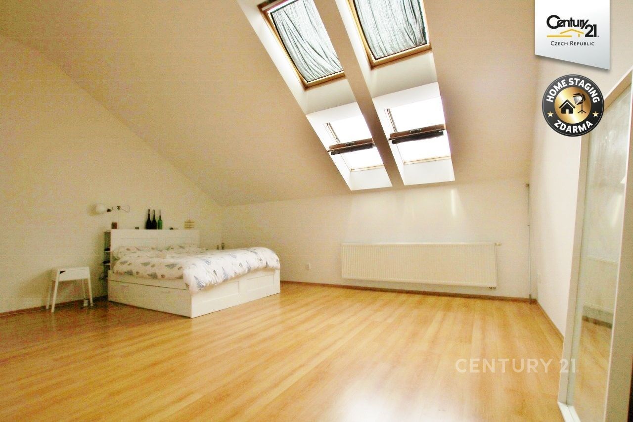 Byt se skládá: ze spojovací chodby, dvou ložnic ( jedna se šikminou s orientací na S a druhá bez šikmin s orientací na V), koupelny s vanou a toaletou, obývacího pokoje s kuchyní a schodištěm do patra na střešní terasu. Kuchyně je vybavena myčkou, lednicí, horkovzdušnou troubou a varnou deskou. Podlahy v bytě jsou plovoucí a okna plastová. V technické místnosti je plynový kotel na ohřev vody a topení v bytě. K nájmu se připočítává paušál za služby 3 300 Kč/2.os./měsíc vč. DPH (každá další osoba 700 Kč), elektřina s plynem se přepisuje na nájemce (cca 4 000 Kč). Majitel požaduje dva nájmy a služby jako jistotu/kauci ve výši 68 600 Kč. Provize pro RK je jeden nájem plus DPH 21 % ve výši 37 510 Kč.