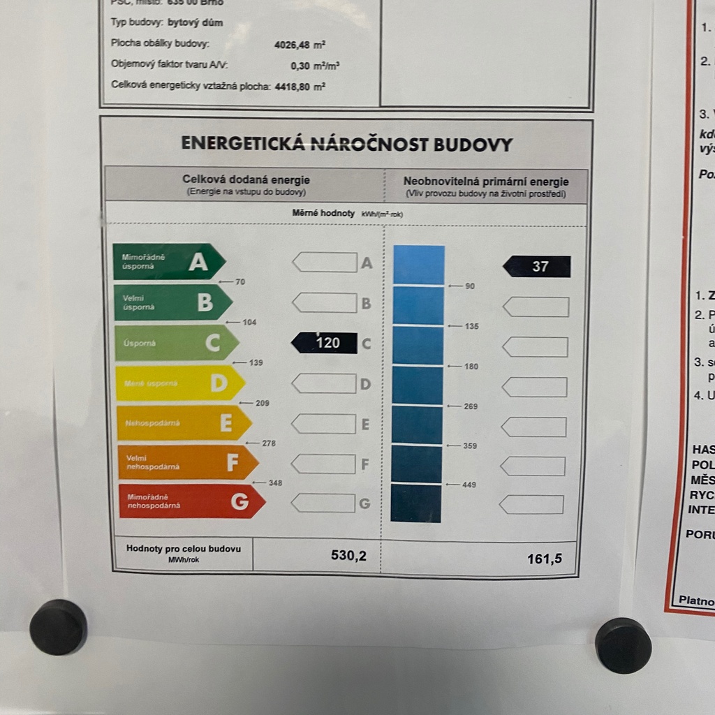 - Ukazatel energetické náročnosti budovy: 120 kWh/m²