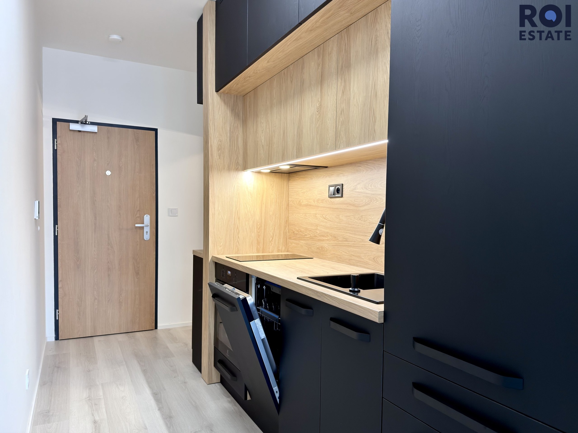 Interiér je moderní a vzdušný. Obytný prostor je chytře rozdělen elegantní skleněnou stěnou, která dodává bytu styl a zároveň zachovává dostatek světla. Kuchyňská linka je vyrobena na míru, je plně vybavena vestavěnými spotřebiči značky Electrolux ( trouba, indukční varná deska, digestoř, myčka), takže se můžete ihned.