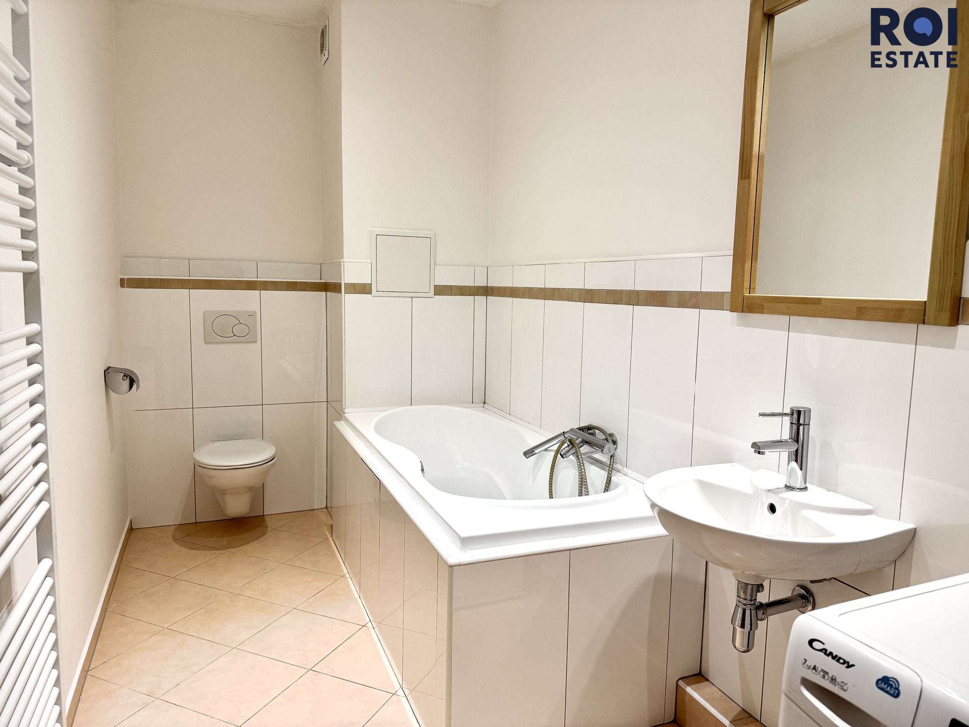 V bytě je manželská postel z masivu, moderní kuchyňská linka s vestavnými spotřebiči (varná deska, LG mikrovlnná trouba, lednice), pračka Candy a vana pro relaxaci.