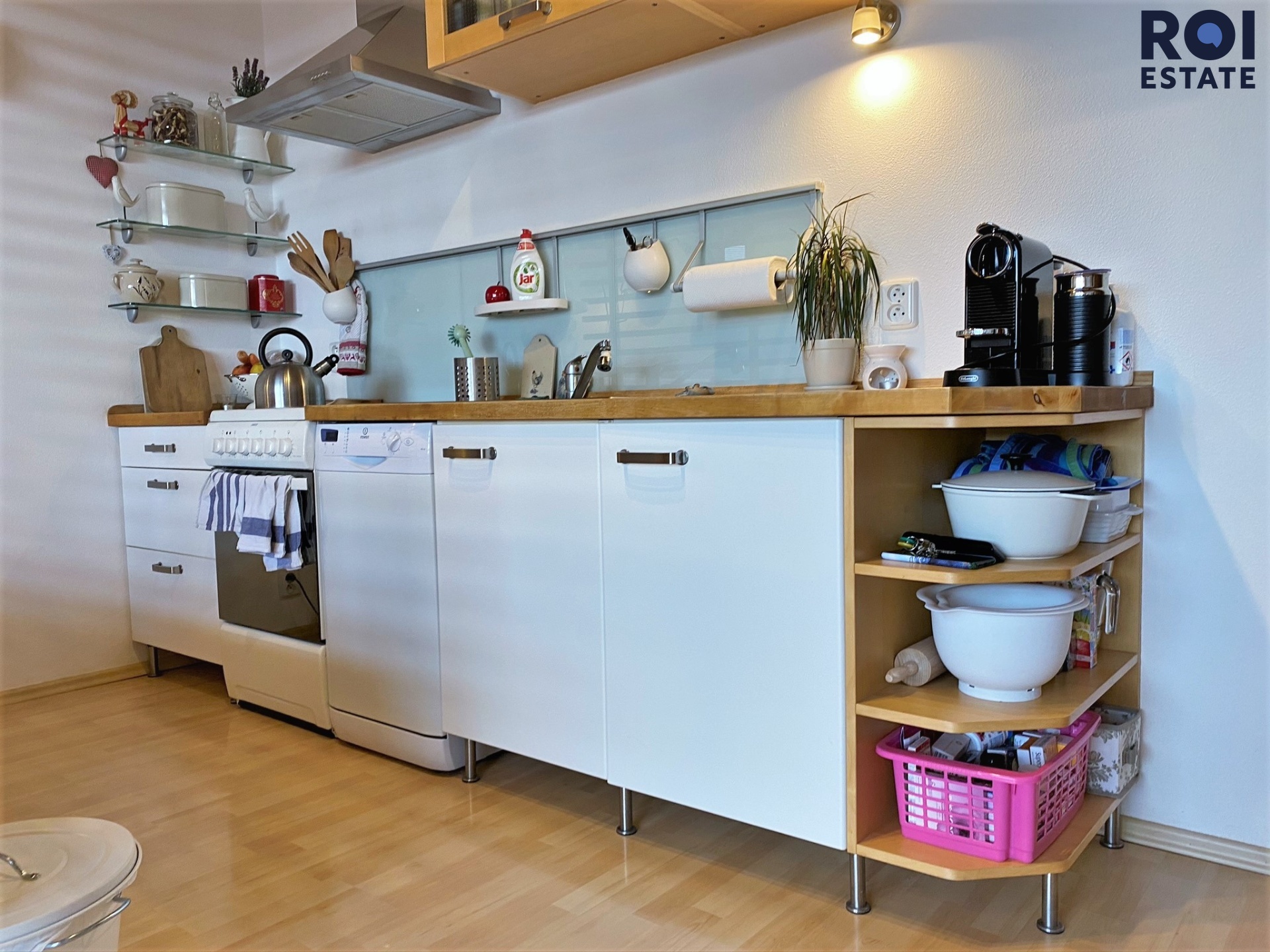 Mezi vybavení bytu patří kuchyňská linka, lednice, vestavěná skříň na míru umístěná v předsíni. Koupelna disponuje prostorným sprchovým koutem, toaletou a plně funkční pračkou.