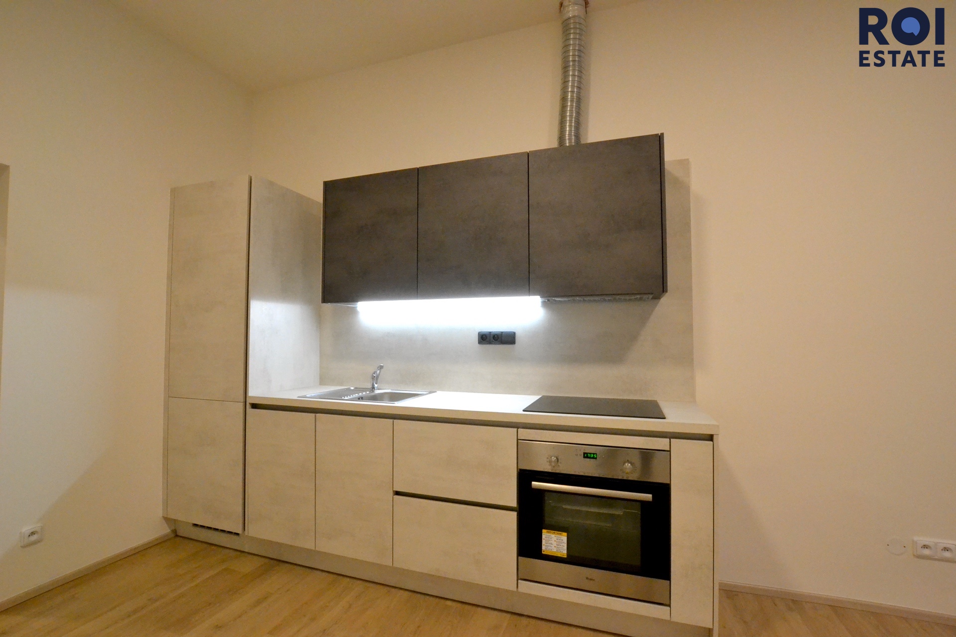 Kuchyně jsou nové na zakázku od stolaře a jsou vybaveny vestavěnou lednicí, myčkou nádobí, troubou, varnou deskou a digestoří. Všimněte si krásné vinylové podlahy v dekoru dřeva. Také se můžete těšit na vestavěnou skříň v ložnici.