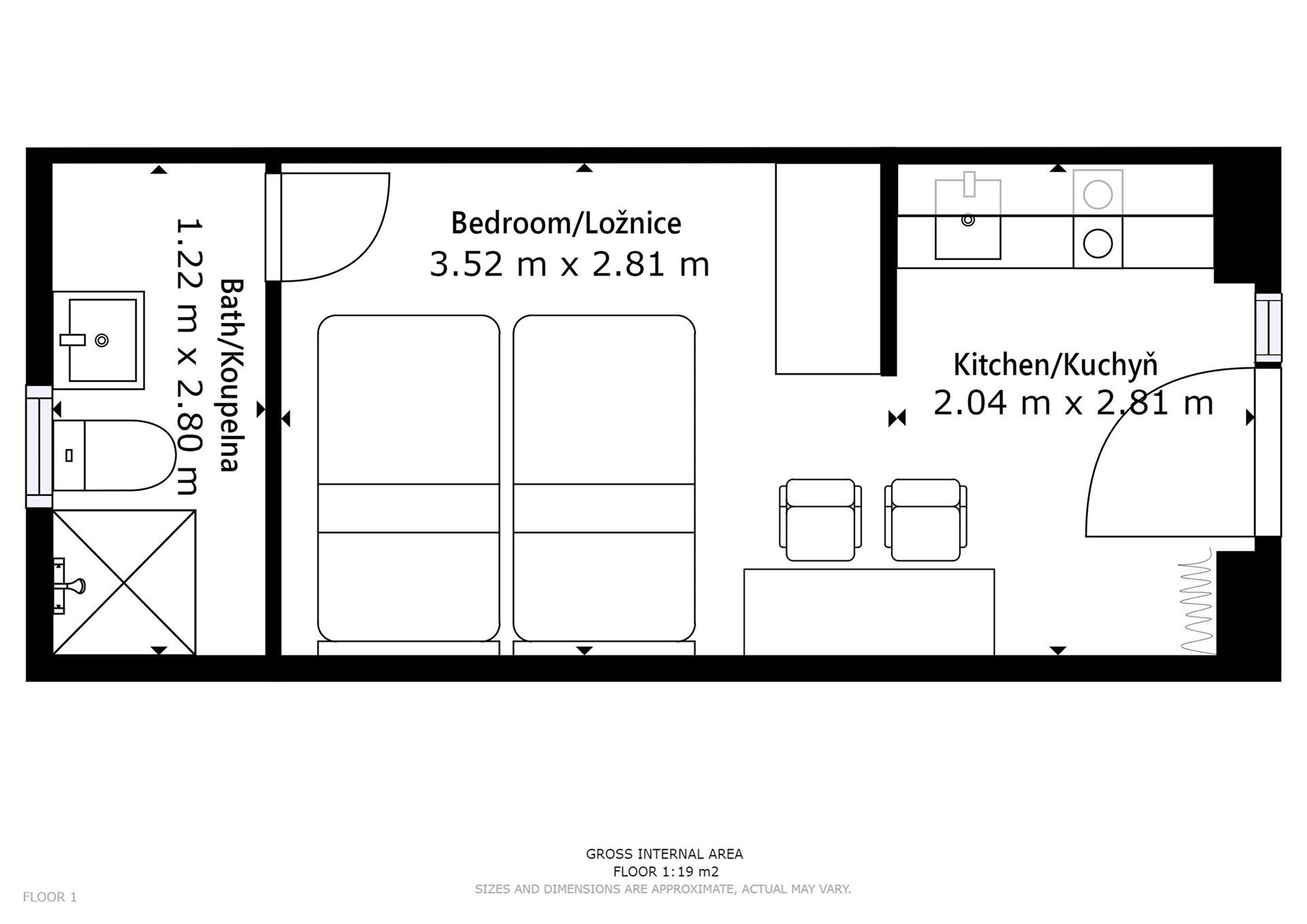 | Dispozice/podlahová plocha: | 1+kk/18 m² |