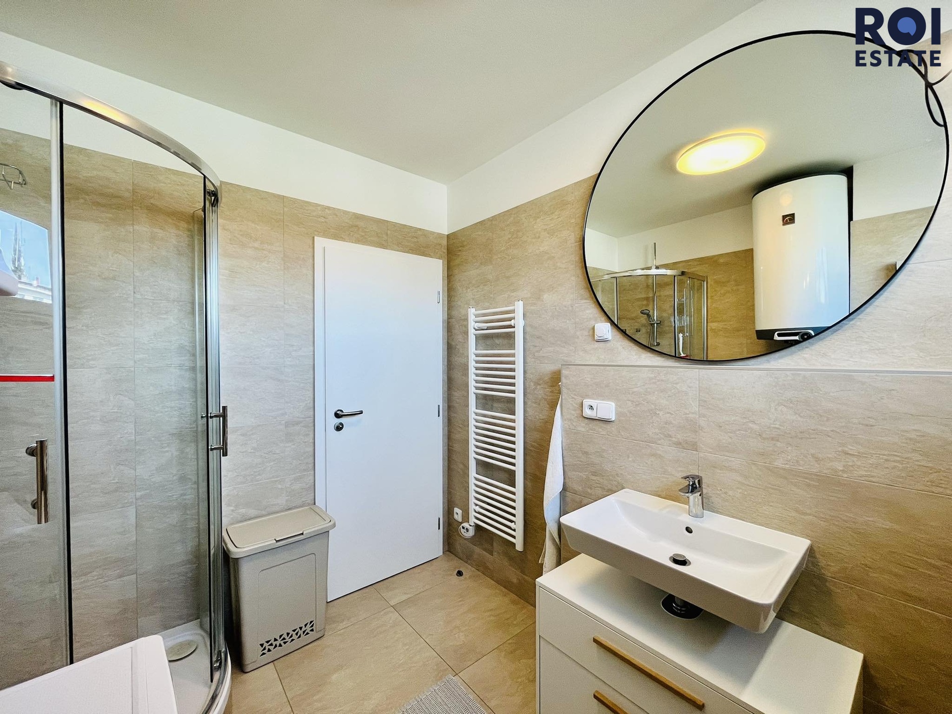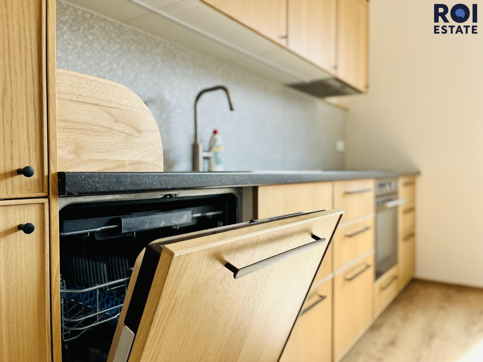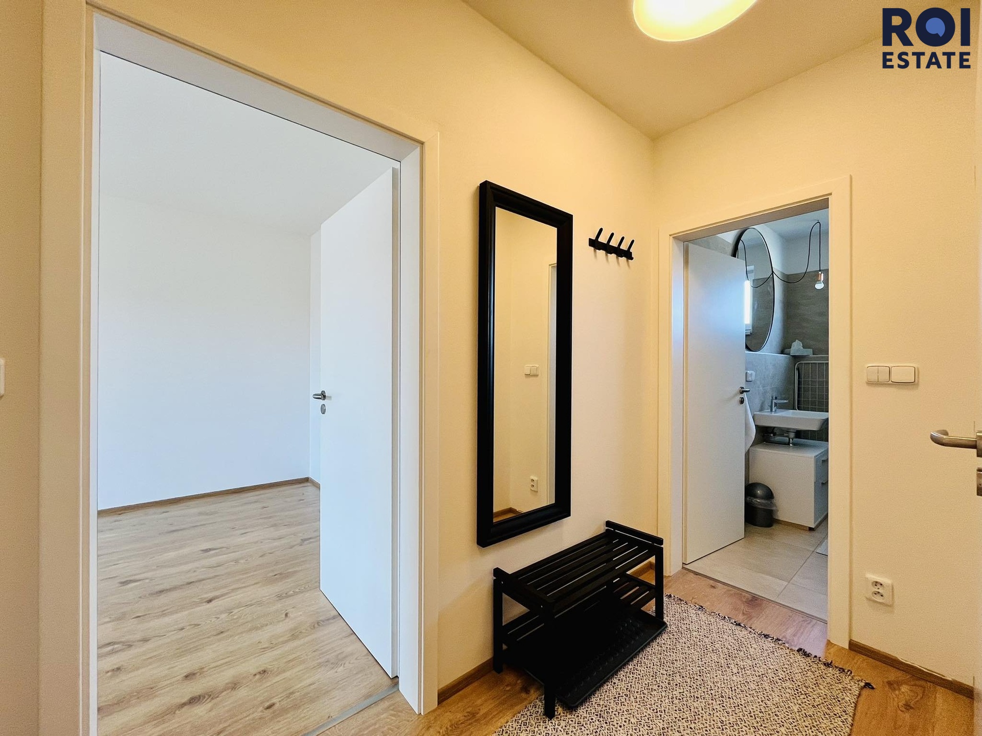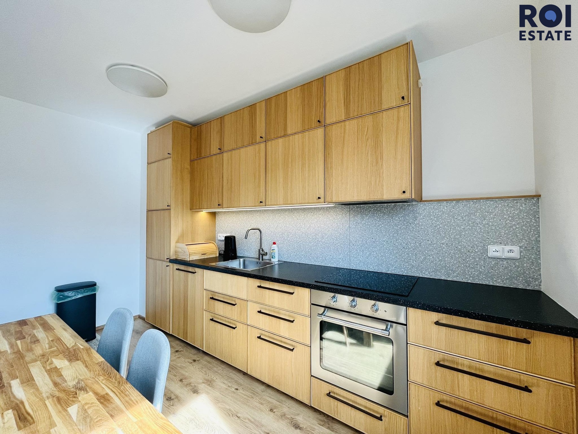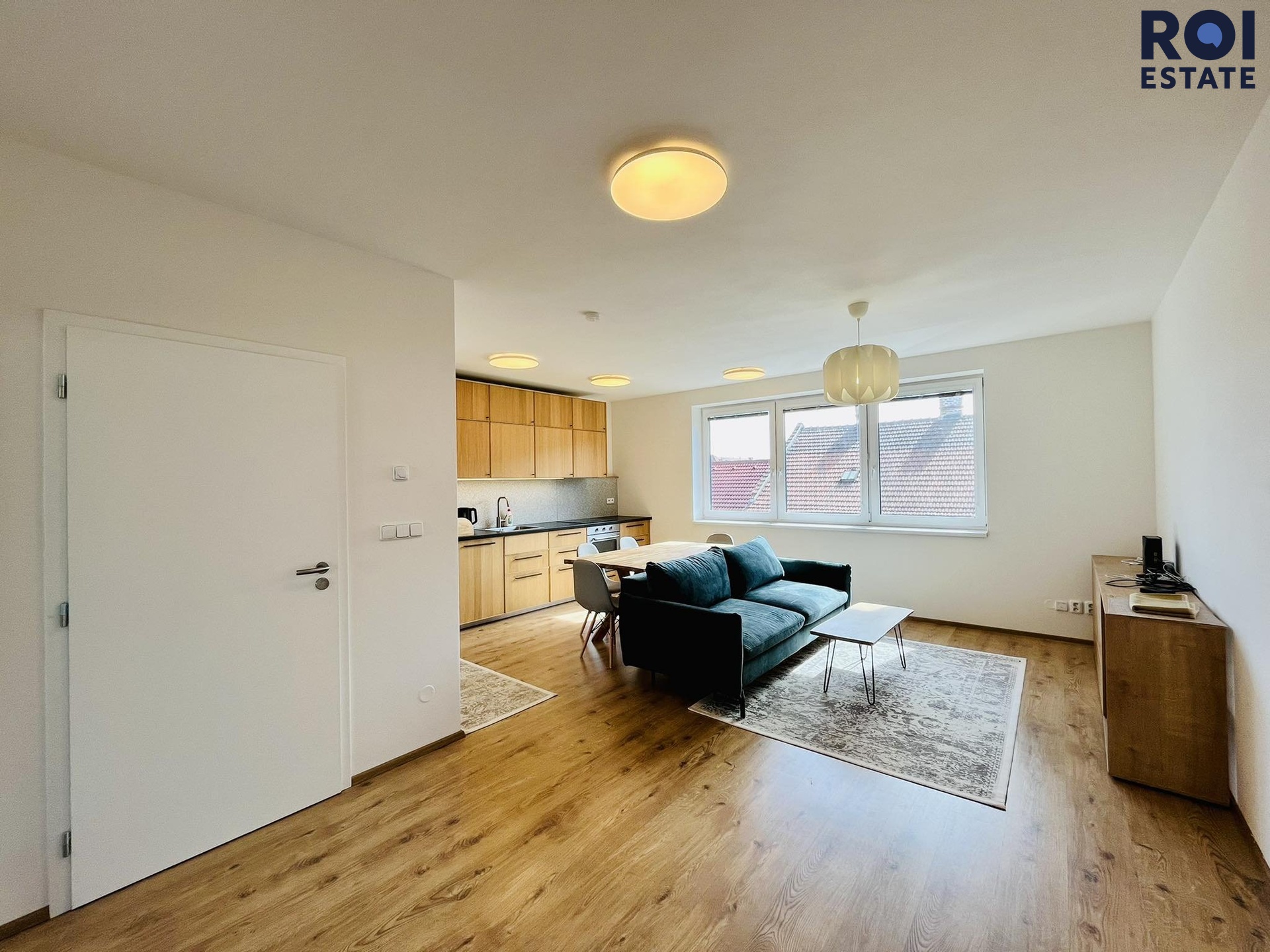 Při příchodu do bytu se ocitnete v chodbě, která Vás provede celým bytem, nachází se zde také úložný prostor ve formě skříní. Naší první zastávkou z chodby bude úklidová/technická komora, kde můžete skladovat své úklidové, či jiné potřeby. Potěší Vás také prostorná koupelna v krásném designu s pračkou, sprchovým koutem a vlastním oknem, které dává svým světlem koupelně krásnou energii. Dále se z chodby dostaneme do velmi prostorného obývacího pokoje, kde Vám bude chybět již jen televize, protože je částečně zařízený. Potěší Vás kuchyňská linka se spotřebiči jako je myčka, lednice s mrazákem či indukční deska, dřevěný stůl nebo například designový gauč s konferenčním stolkem z masivu. Třetinu místnosti lze dovybavit a udělat si zde například krásnou pracovnu. Naší poslední zastávkou je ložnice orientovaná do vnitrobloku a zeleně, tudíž se o obavy z ruchu opravdu bát nemusíte. V ložnici zůstává postel se skříní, stačí si tedy jen pořídit povlečení. Celý byt působí světlým a přírodním dojmem, barvy jsou v dekoru dřeva.