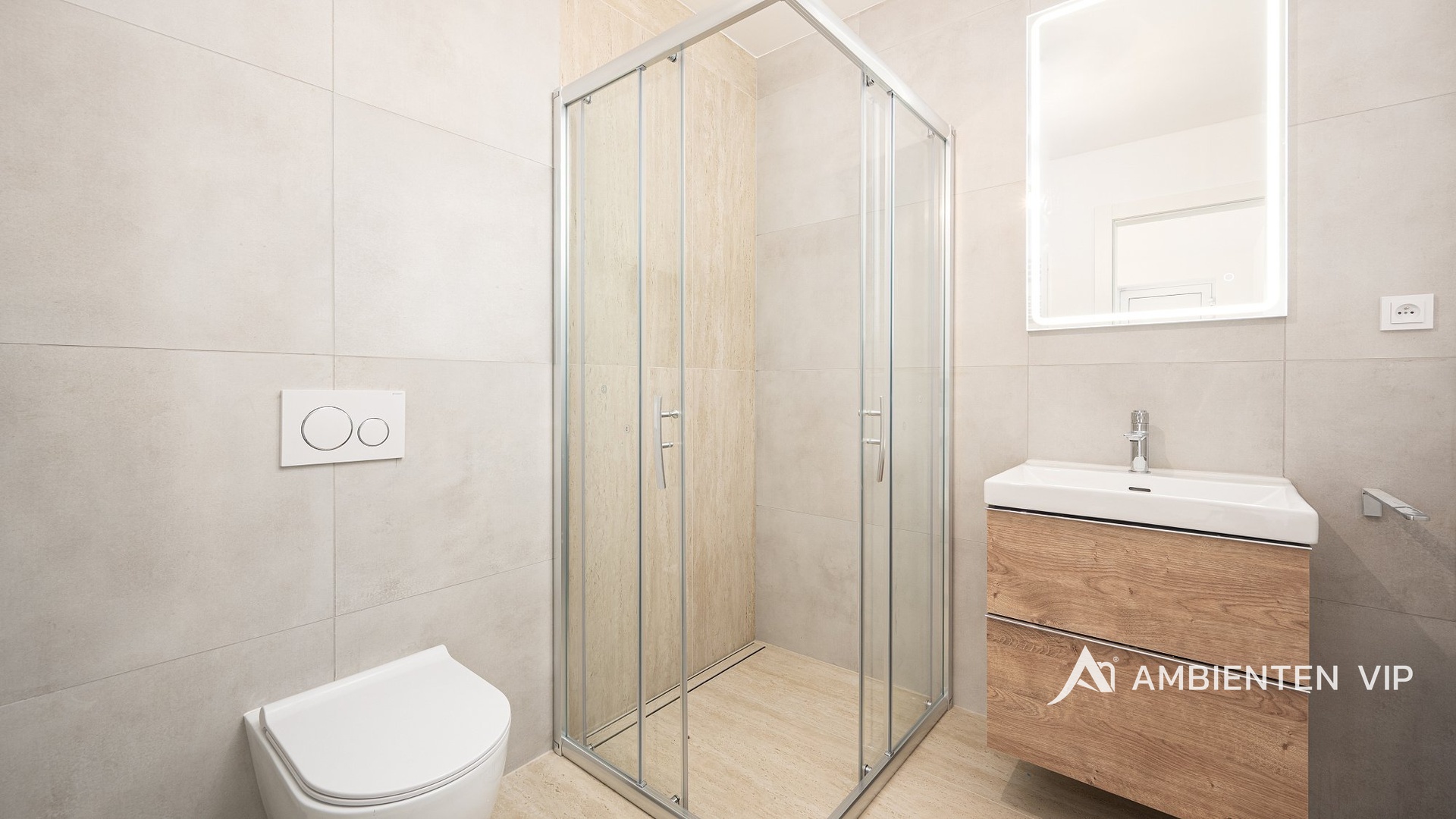 Koupelna je vybavena moderním walk-in sprchovým koutem, keramickou dlažbou a obklady, závěsným WC a přípravou na pračku a sušičku. Podlahy v obytných místnostech jsou vinylové, v koupelně a na toaletě keramická dlažba. Bezpečnostní systém bytu zajišťuje instalace Jablotronu, a vstup do objektu kontroluje centrální videotelefon s kamerou.
