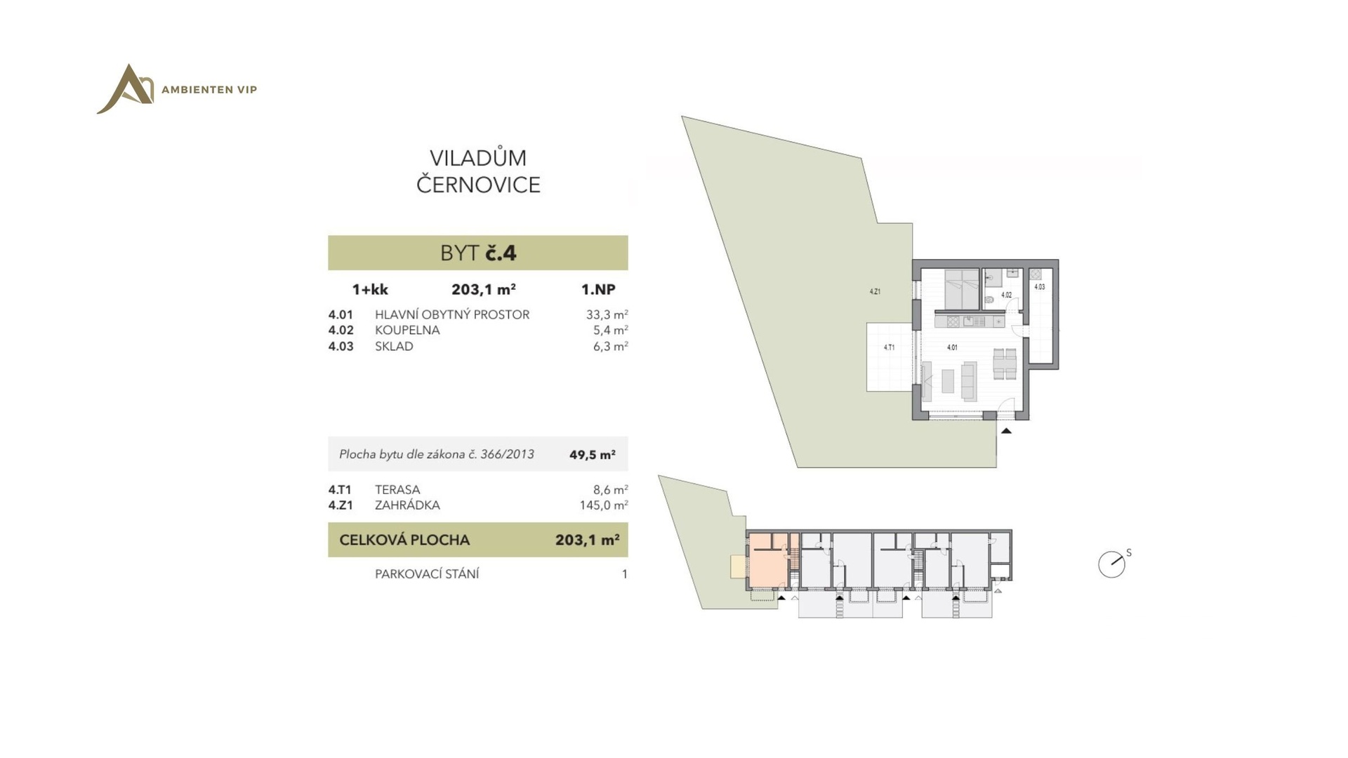 Byt nabízí praktické zádveří, koupelnu a hlavní obytný prostor s kuchyňským koutem. Z obytného prostoru je přímý vstup na terasu, která navazuje na soukromou zahradu. Venkovní parkovací stání je součástí uzavřeného areálu před viladomem a je zabezpečeno dálkově ovládanou závorou.