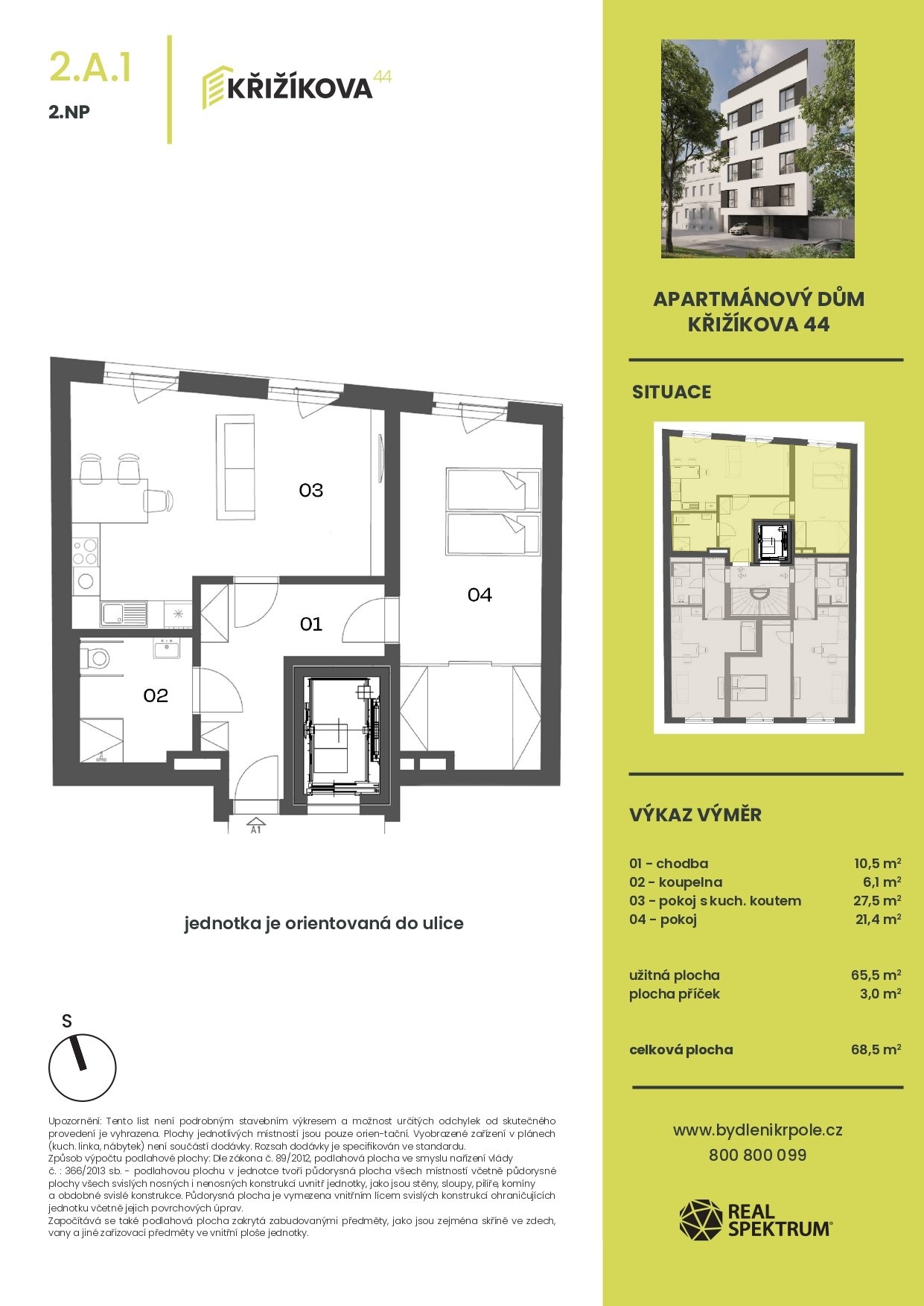 chodba (10,5 m²), obývací pokoj s kuchyňským koutem (27,5 m²), pokoj (21,4 m²), koupelna s WC (6,1 m²), sklep