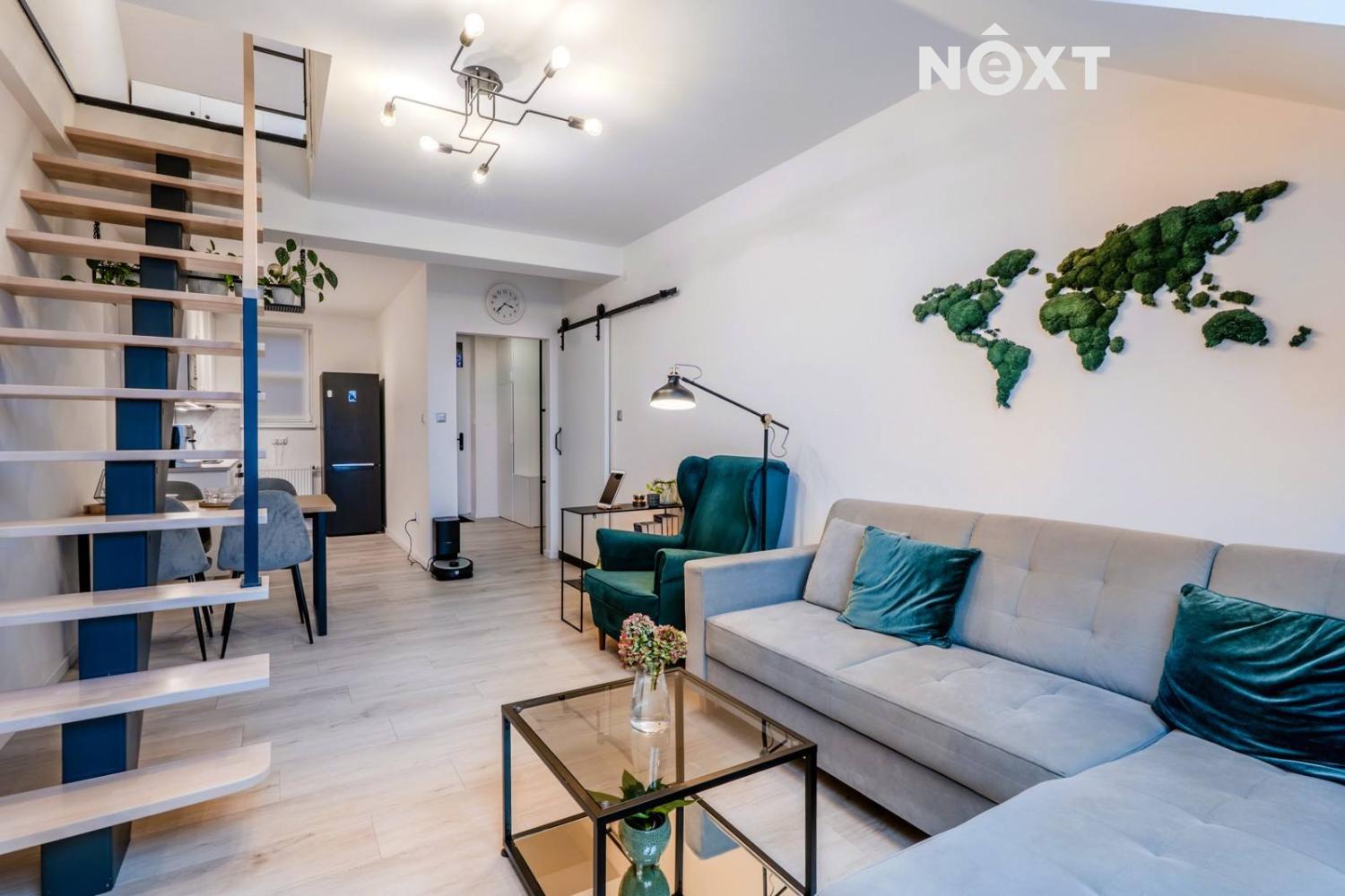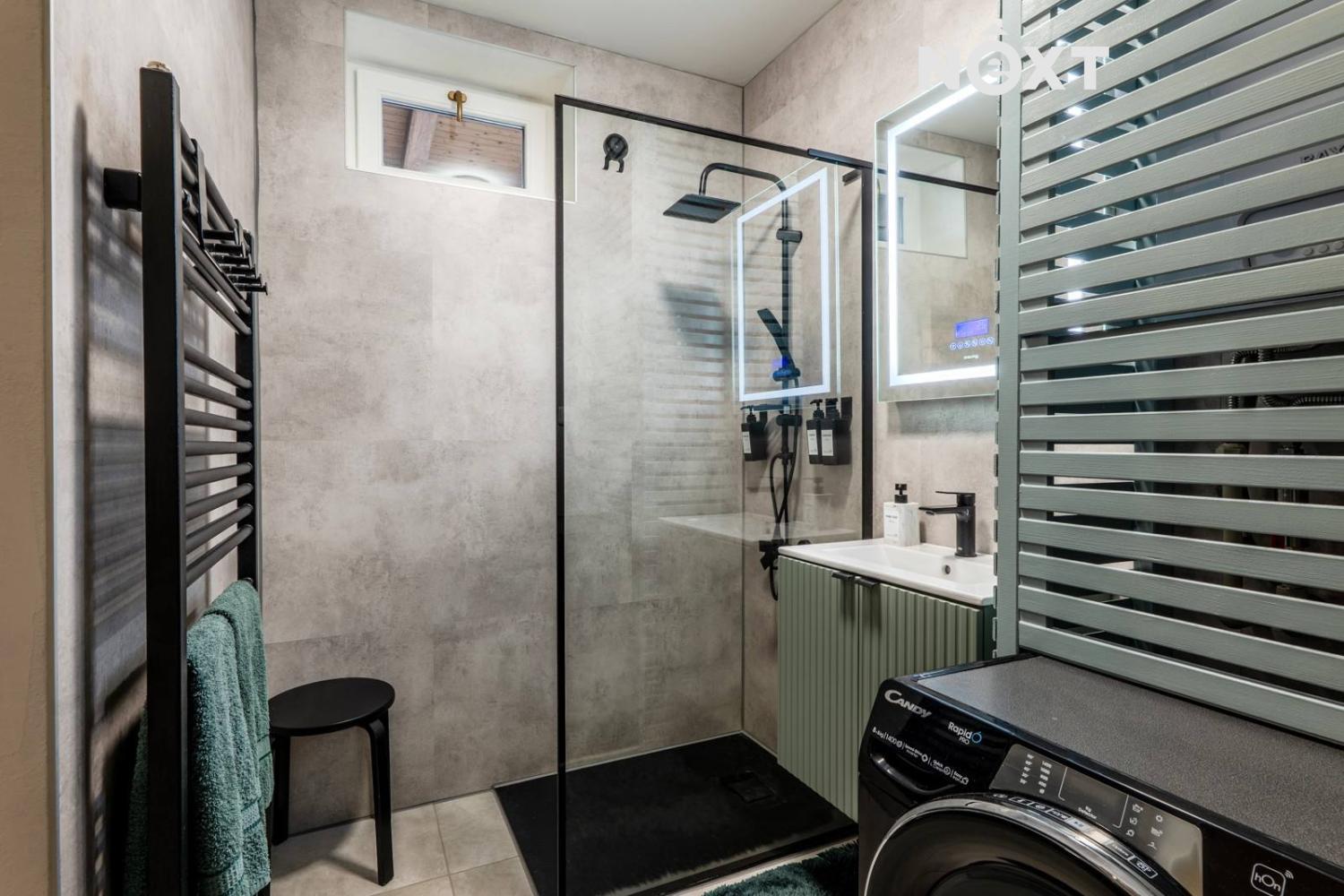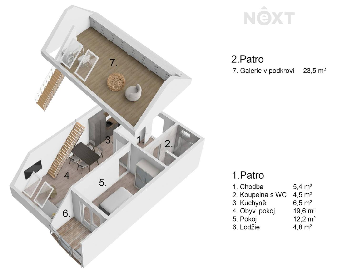 V bytě je k dispozici předsíň (5,4 m2), ze které je vstup do koupelny (4,5 m2) se sprchou, umyvadlem, toaletou a do obývacího pokoje (19,6 m2) s kuchyňským koutem (6,5 m2). Ranní kávu si za teplých dní můžete vychutnat v lodžii (4,8 m2) navazující na ložnici (12,2 m2) přístupnou z obývacího pokoje. Z obývacího pokoje se doslova vznáší jednoramenné schodiště do podkrovního pokoje (23,5 m2). Ústřední vytápění bytu a ohřev TUV zajišťuje vlastní zánovní kotel na zemní plyn . Bonusem tohoto bytu je i instalovaná klimatizace.