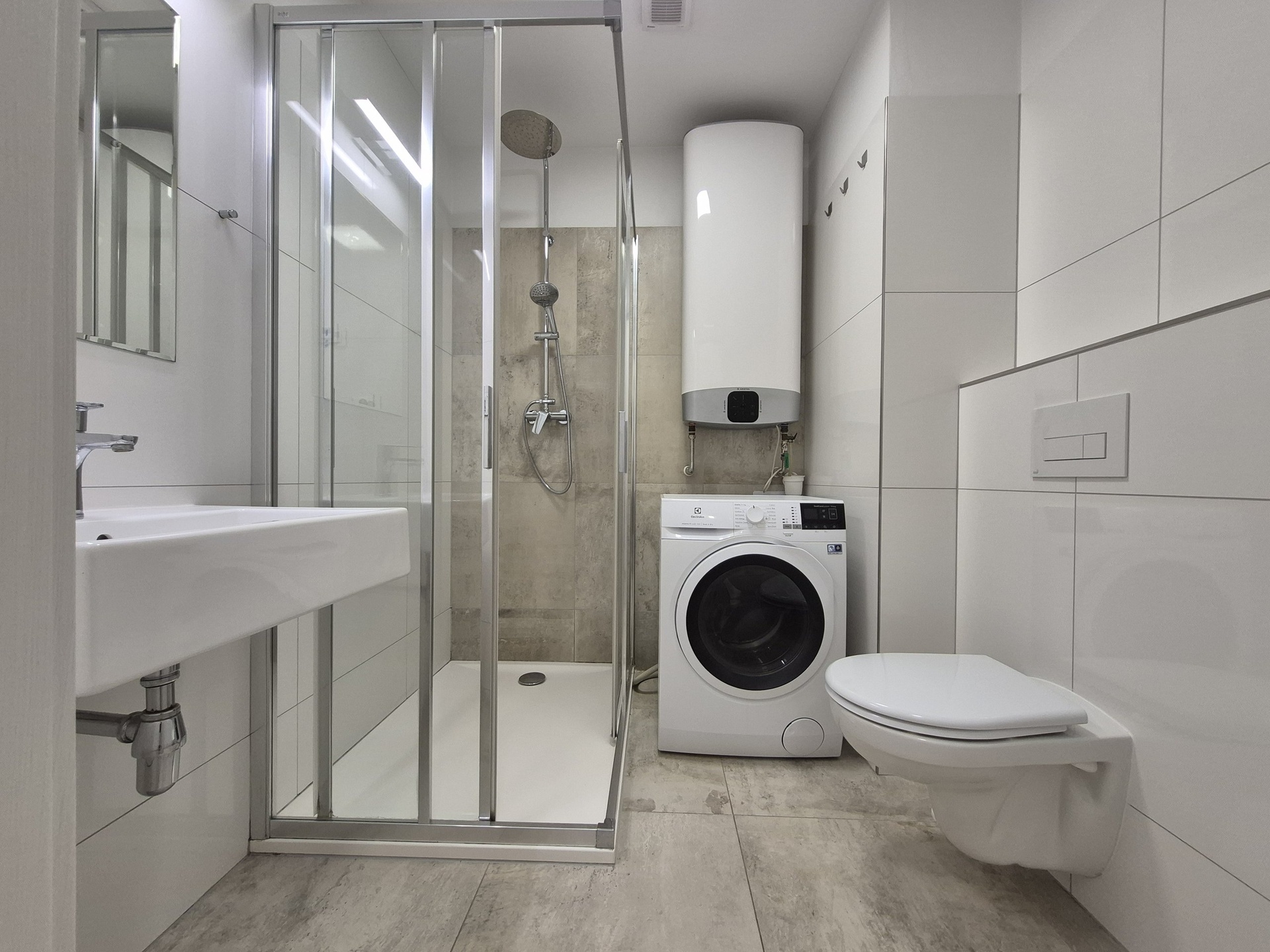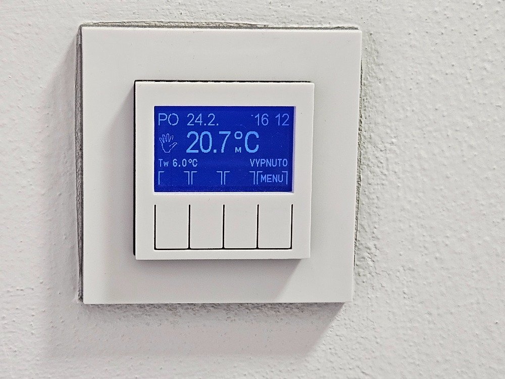 V bytě je vytápění řešeno elektrickým podlahovým topením. Každá místnost má vlastní termostat, díky čemuž si můžete teplotu snadno regulovat podle svých potřeb. Ohřev vody je zajištěn elektrickým bojlerem.
