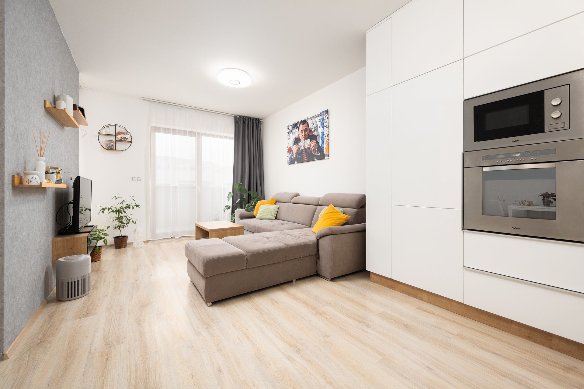 Celý byt je vybaven krásným vkusným nábytkem vyrobeným na míru a ten je také součástí prodeje. Kuchyňská linka je zařízená vestavěnými spotřebiči – horkovzdušná a mikrovlnná trouba, lednice, mrazák, rychlovarná deska a digestoř.