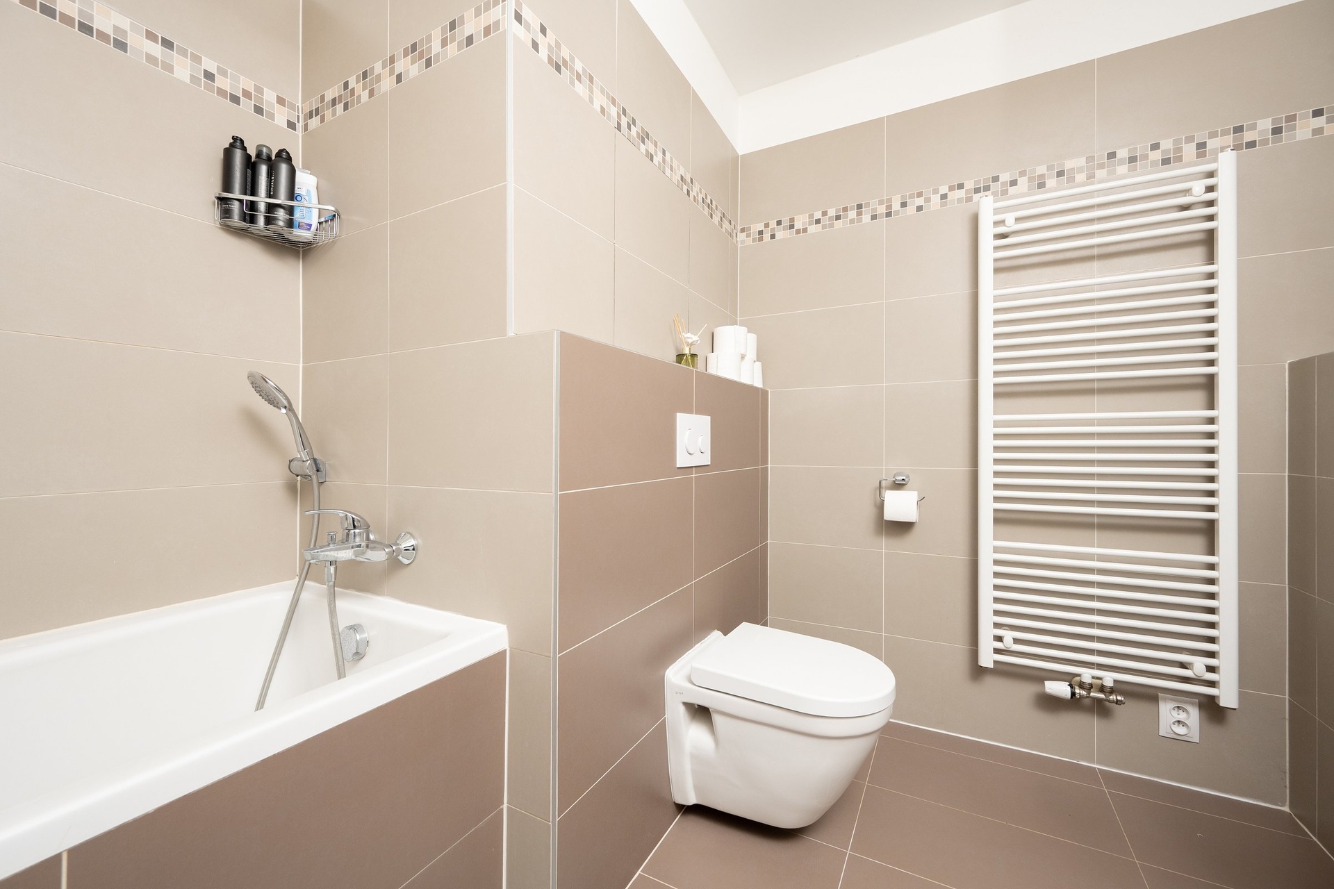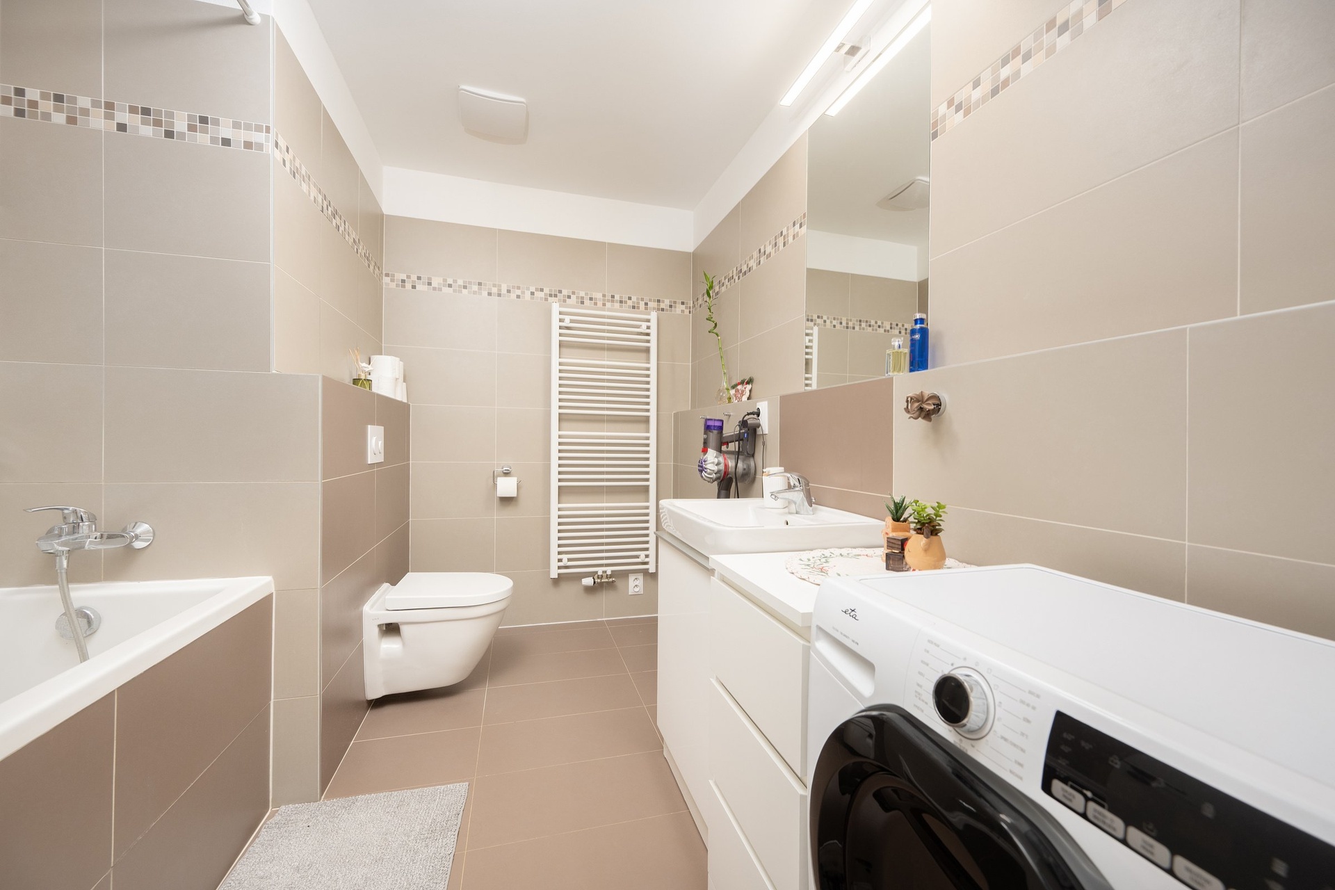 V koupelně s velkou vanou a toaletou je umístěna pračka. Je zde také topný žebřík ke zvýšení tepelného komfortu v případě potřeby.